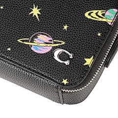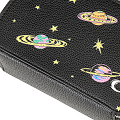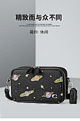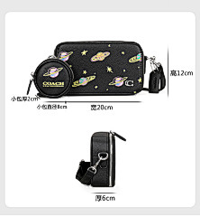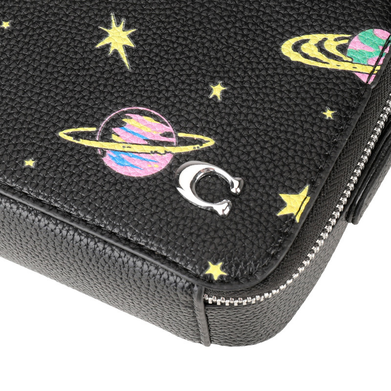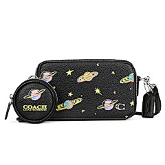 This bag from COACH is based on black and has interesting starry sky-themed patterns such as planets and stars printed on the surface, which is lively and unique. The double zipper design is easy to open and close, so you can properly store small items. Equipped with adjustable shoulder straps, it can be worn on one shoulder or crossbody, suitable for daily travel, shopping and other scenes, adding personality and fashion to the outfit.