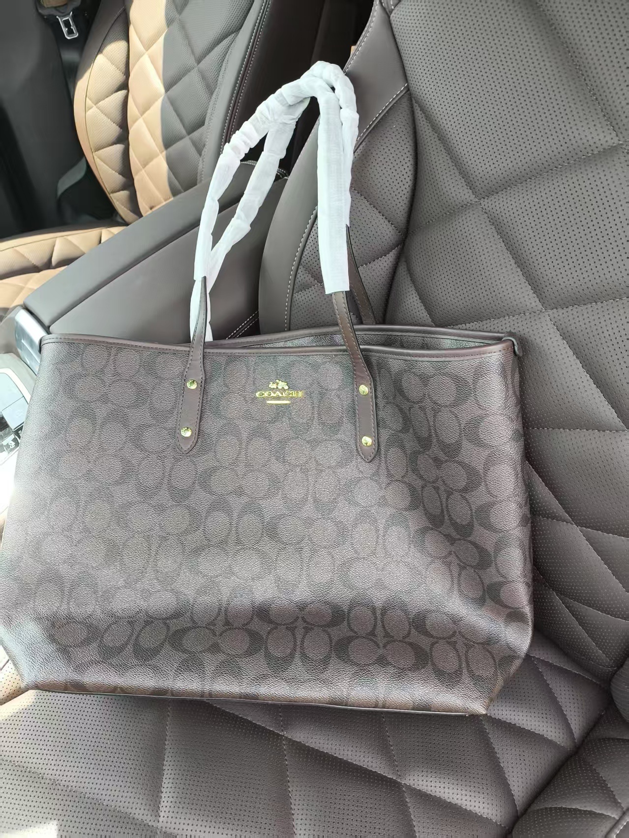 This tote bag is from COACH and features the brand's iconic monogram pattern. The classic brown colour is versatile for various styles. The spacious design caters to everyday commuting, shopping, and other needs. With a minimalist hand-drawn style, the leather handle is accented with metal studs, combining practicality with a sense of fashion, making it a classic piece that embodies American casual style.