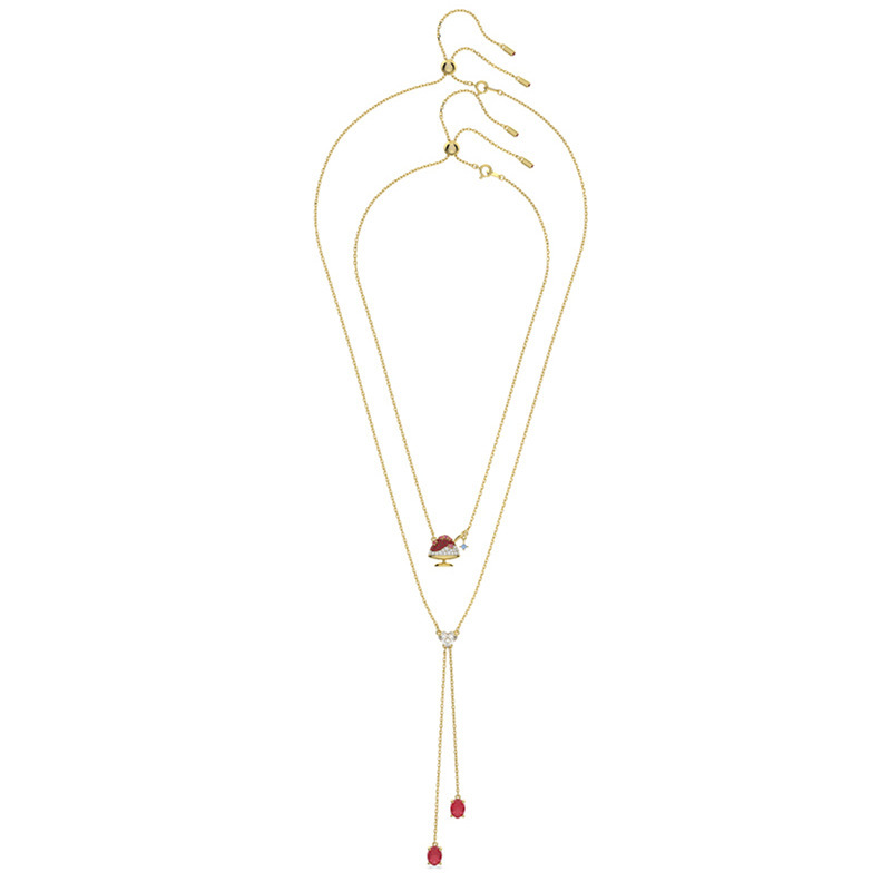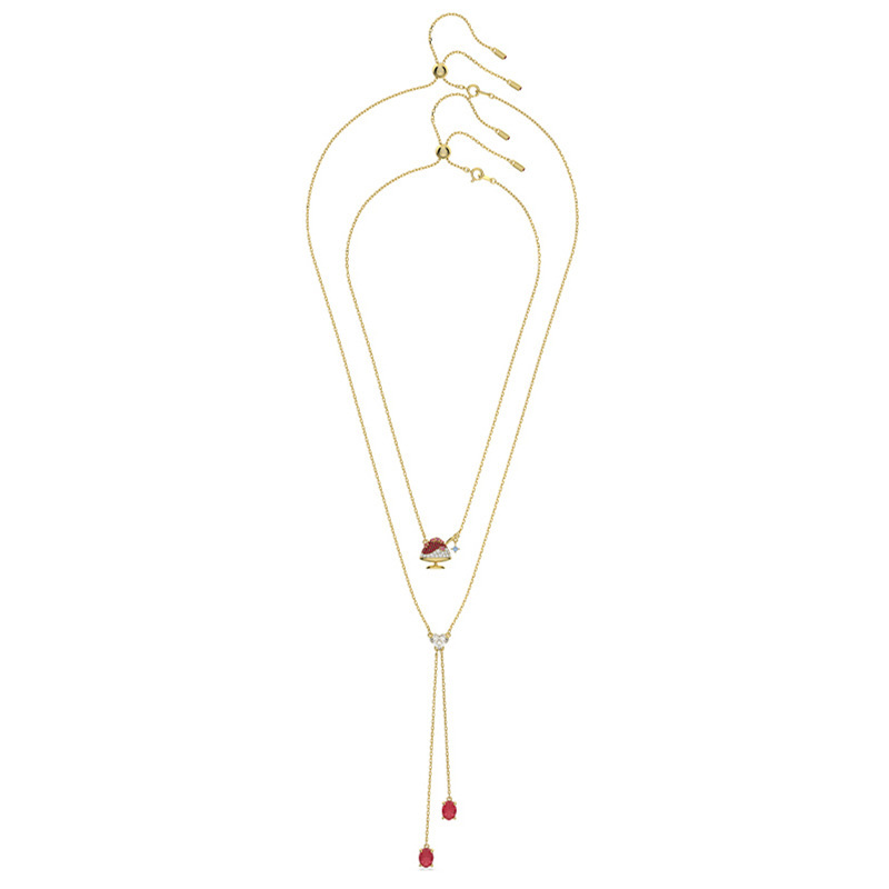 This necklace has a double-layer design, with a delicate cake-shaped pendant on the upper layer, presented in red, white and other colors, with small blue diamonds embellished; The lower layer is connected by a love diamond, dangling two chain bands with an oval ruby hanging at the end. The overall style is sweet and unique, combining fairy tale elements and fashion sense, suitable for adding romantic interest to the outfit, and is a chic accessory that shows personality