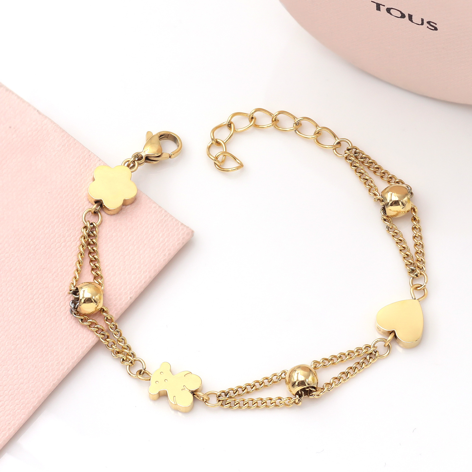 The super cute cute bear double-layer bracelet is 🐻 here The gold double-layer chain with bears, flowers, and love pendants is cute and exquisite, and the sweetness is full~