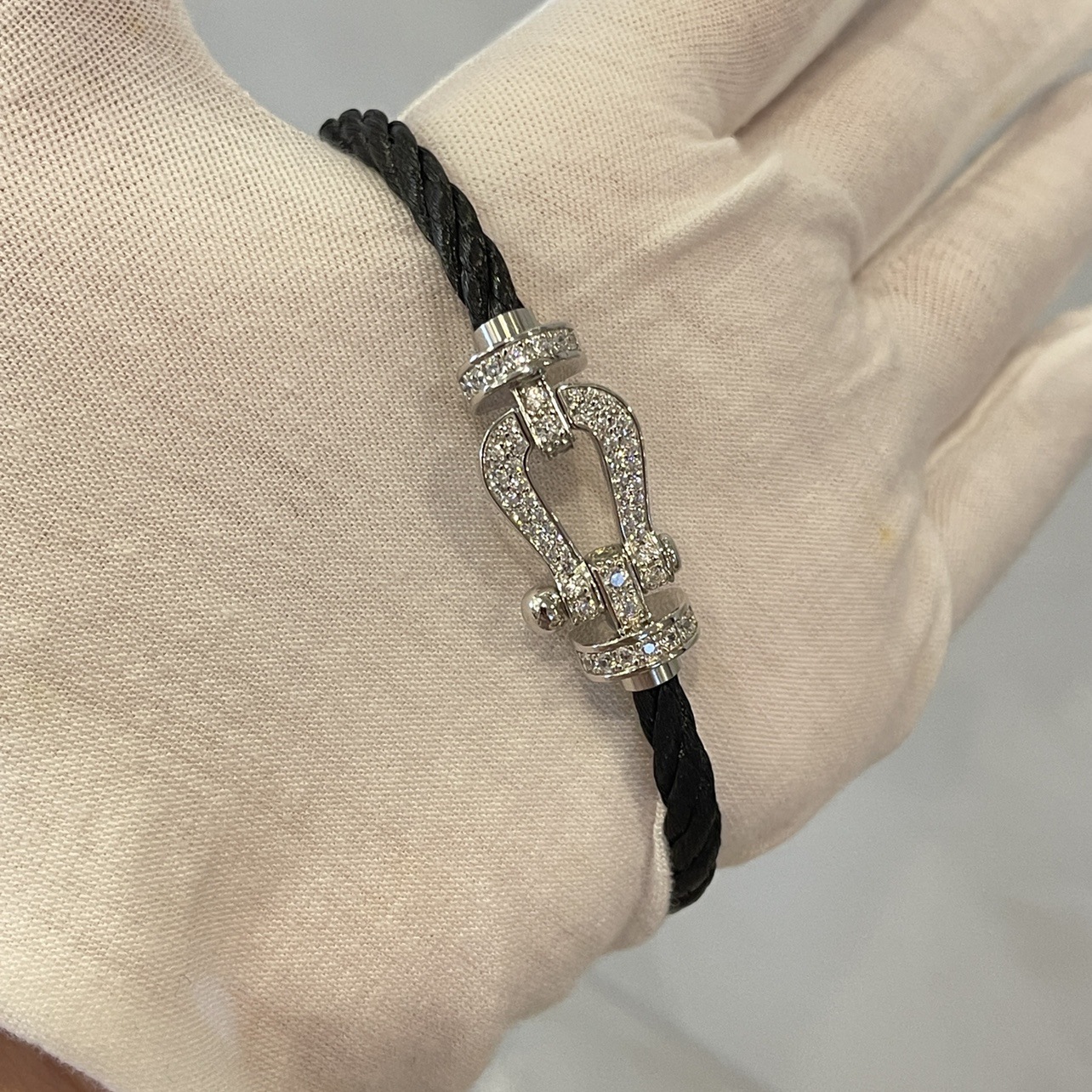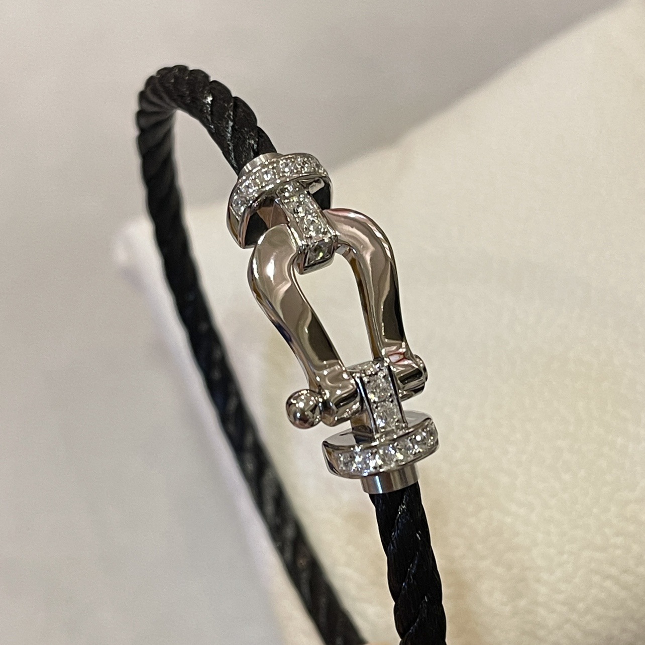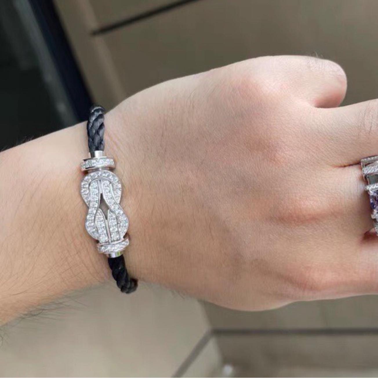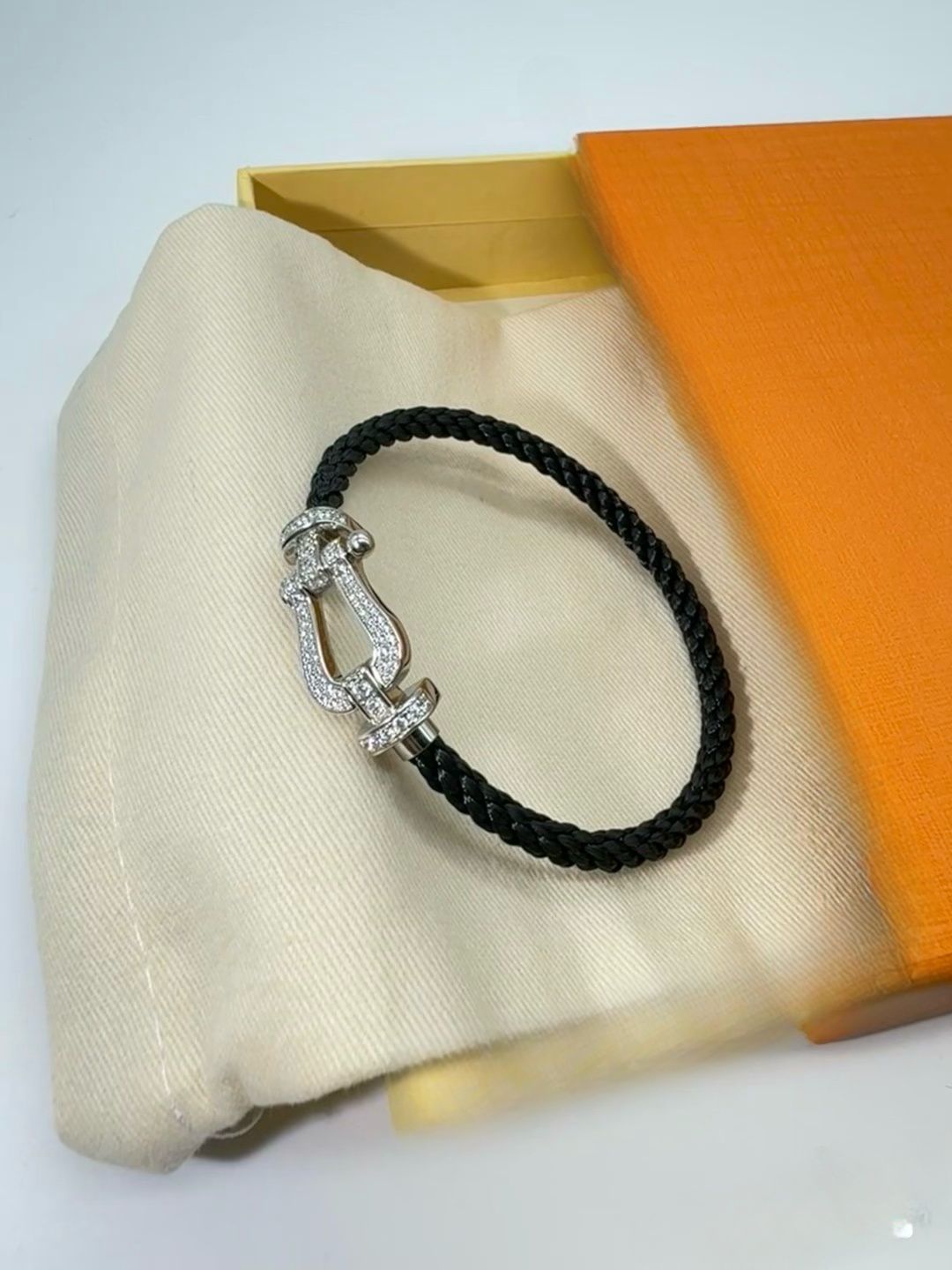 This bracelet features a black braided leather cord as the main body, with a metal buckle encrusted with diamonds, the buckle design is exquisite, the diamonds shine brightly, and the black and white colour scheme is classic and stylish. The bracelet combines the soft texture of leather with the luxury of diamonds, and has a unique style, which can be worn with casual wear to highlight personality, or with formal wear to add a touch of sophistication, suitable for those who pursue fashion and quality.
