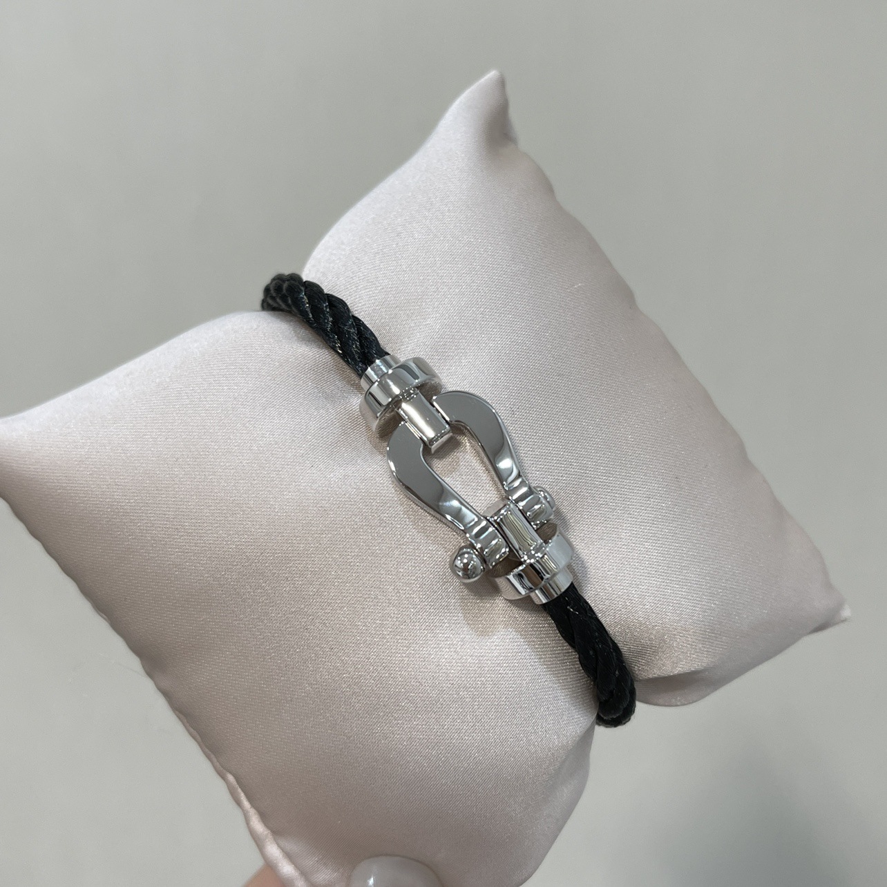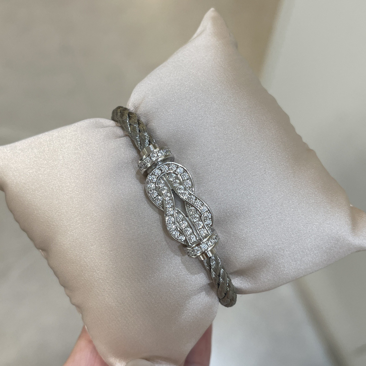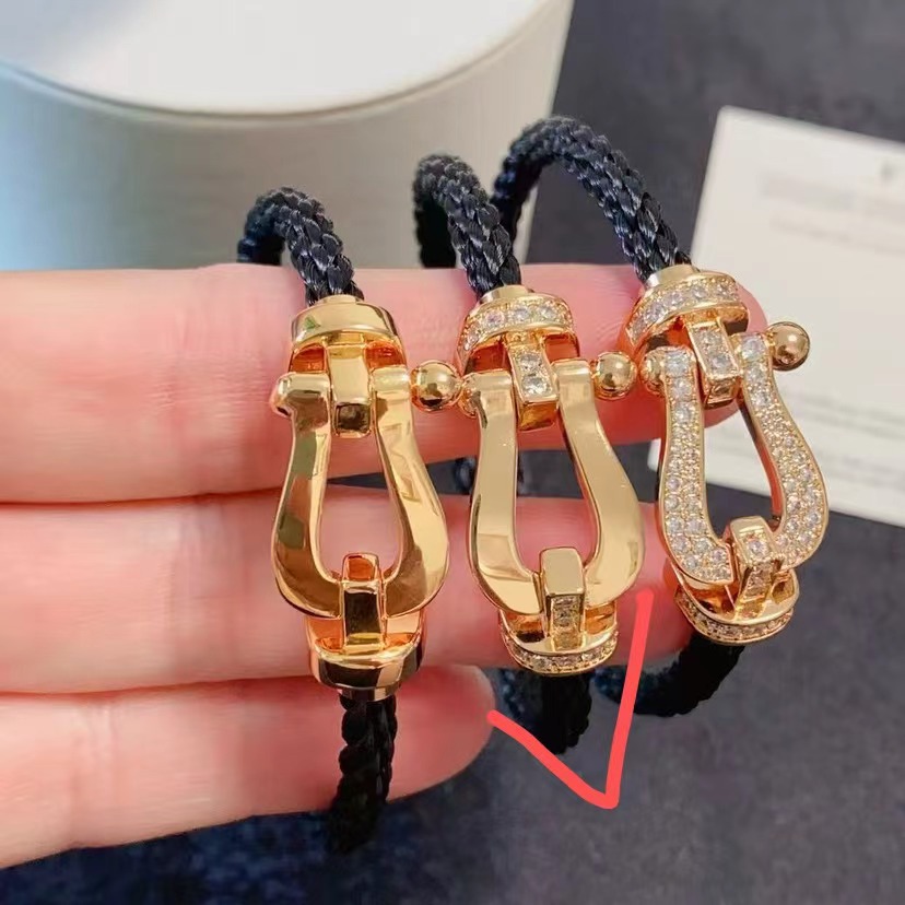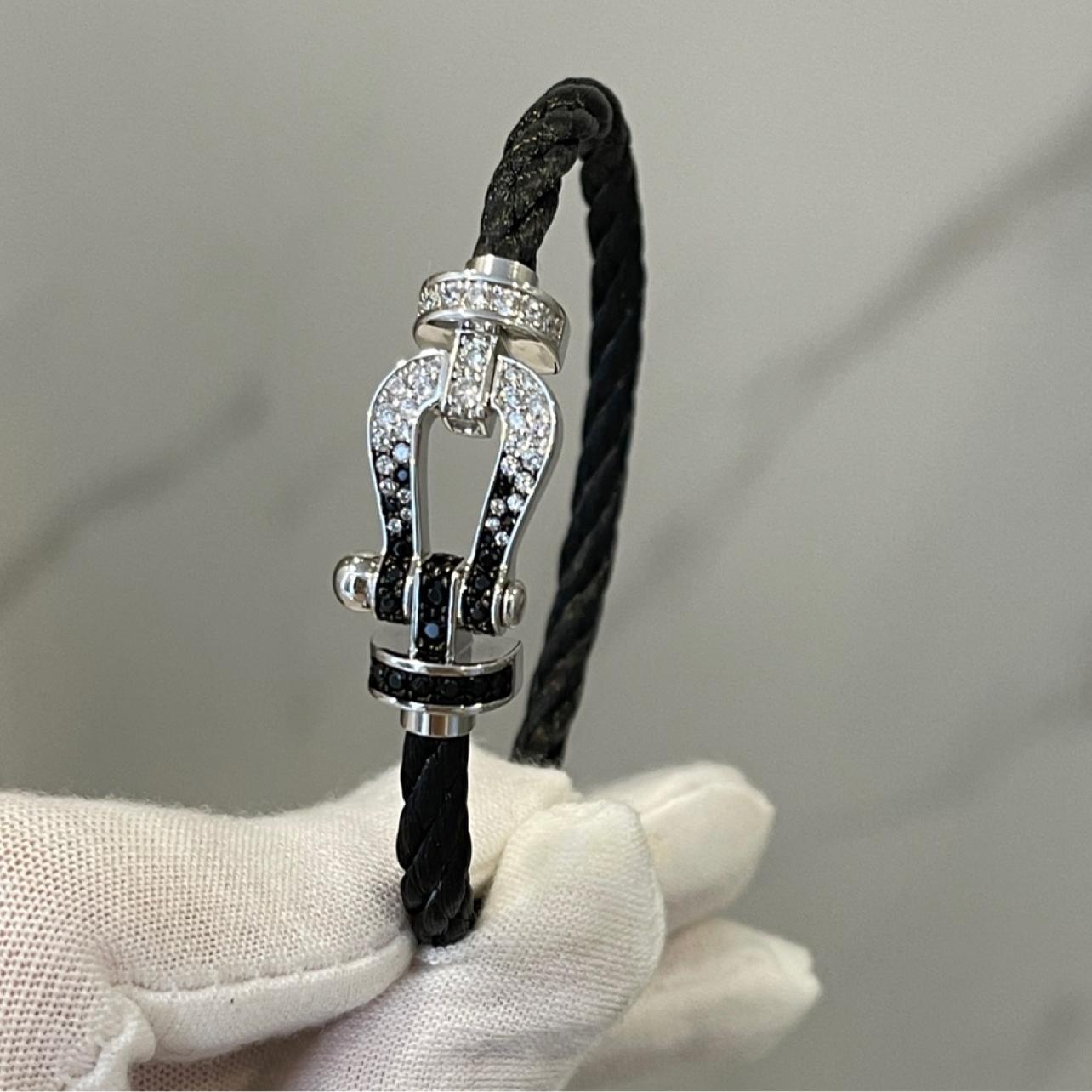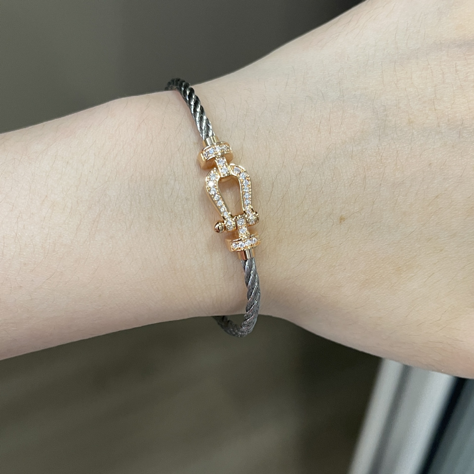 This bracelet features a black braided leather cord as the main body, with a metal buckle encrusted with diamonds, the buckle design is exquisite, the diamonds shine brightly, and the black and white colour scheme is classic and stylish. The bracelet combines the soft texture of leather with the luxury of diamonds, and has a unique style, which can be worn with casual wear to highlight personality, or with formal wear to add a touch of sophistication, suitable for those who pursue fashion and quality.