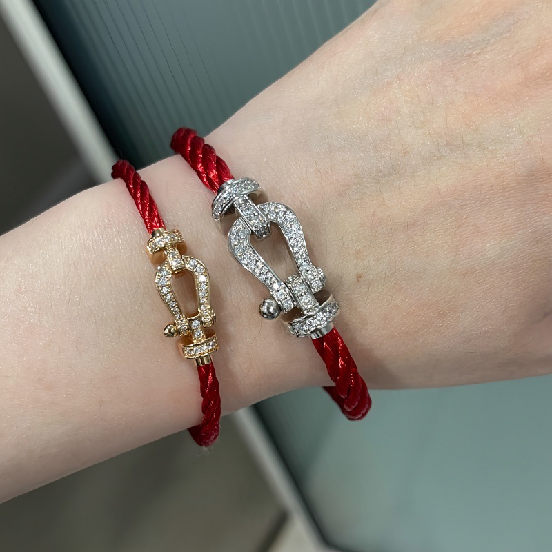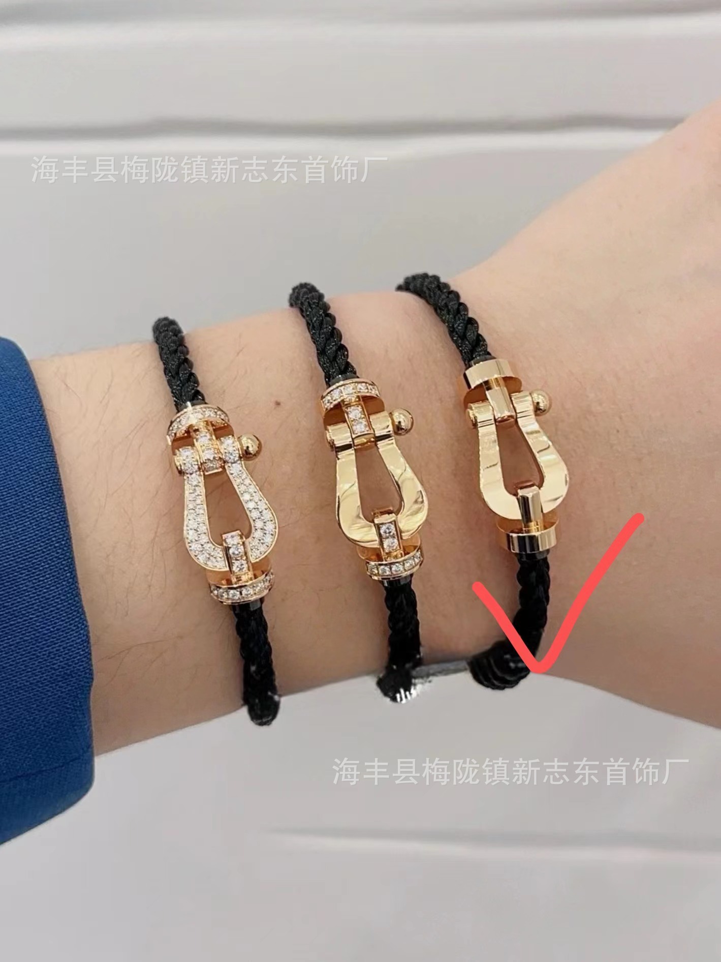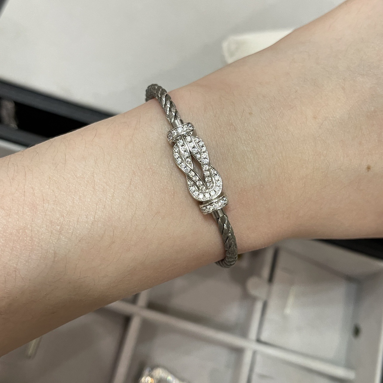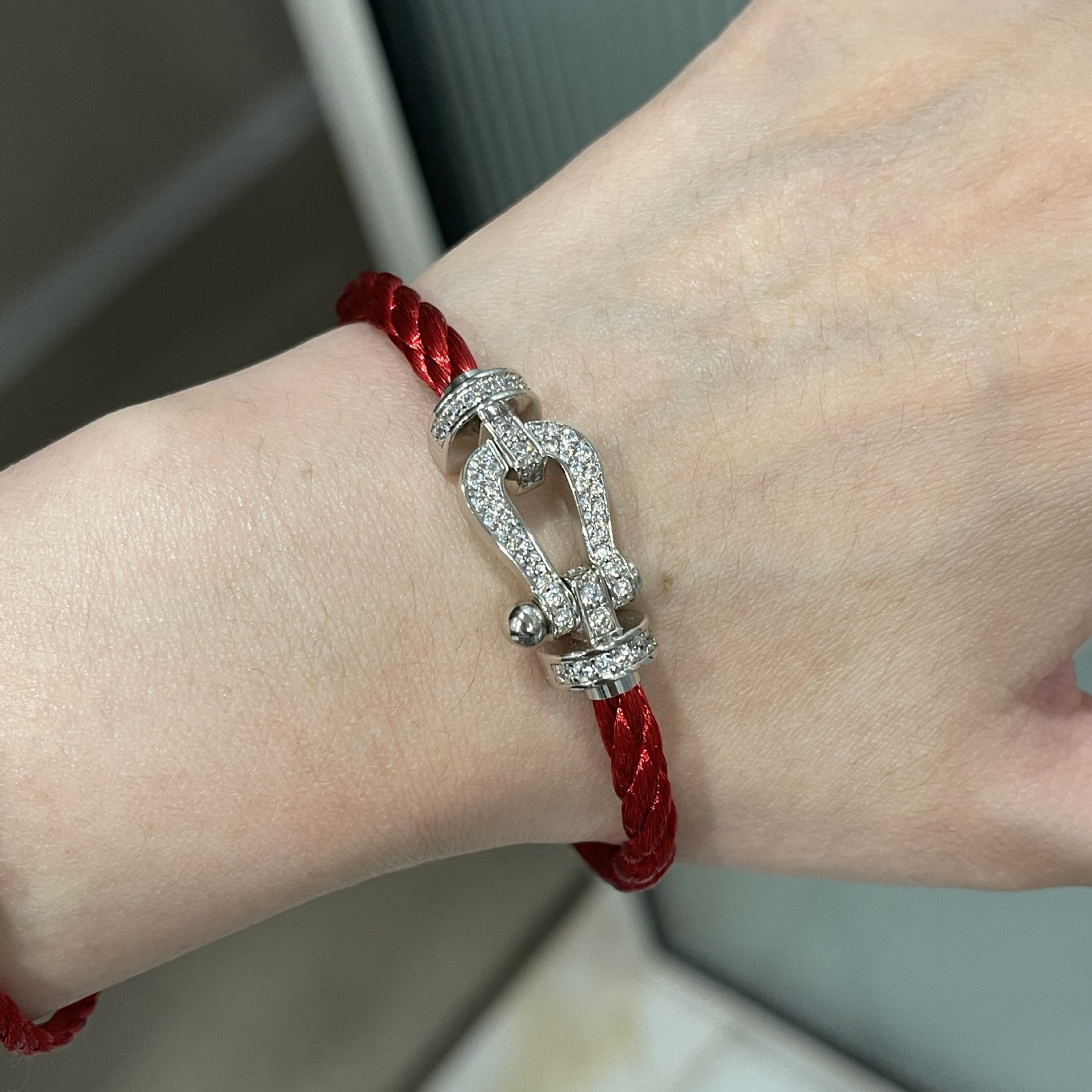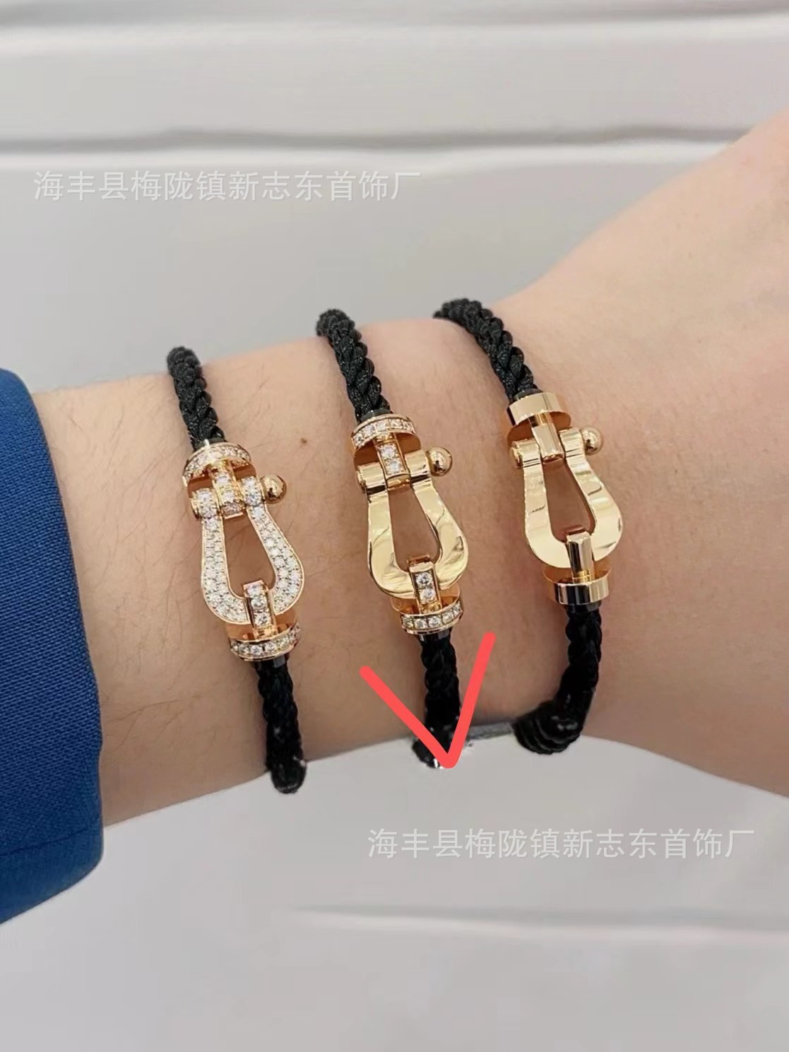 This bracelet features a black braided leather cord as the main body, with a metal buckle encrusted with diamonds, the buckle design is exquisite, the diamonds shine brightly, and the black and white colour scheme is classic and stylish. The bracelet combines the soft texture of leather with the luxury of diamonds, and has a unique style, which can be worn with casual wear to highlight personality, or with formal wear to add a touch of sophistication, suitable for those who pursue fashion and quality.