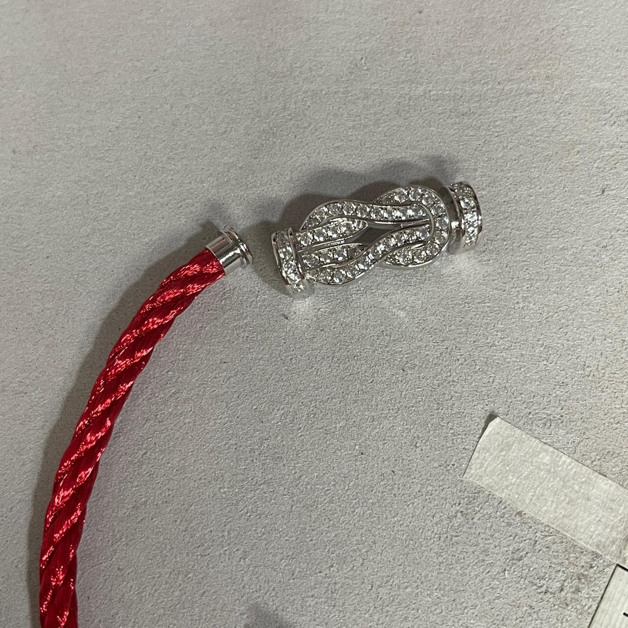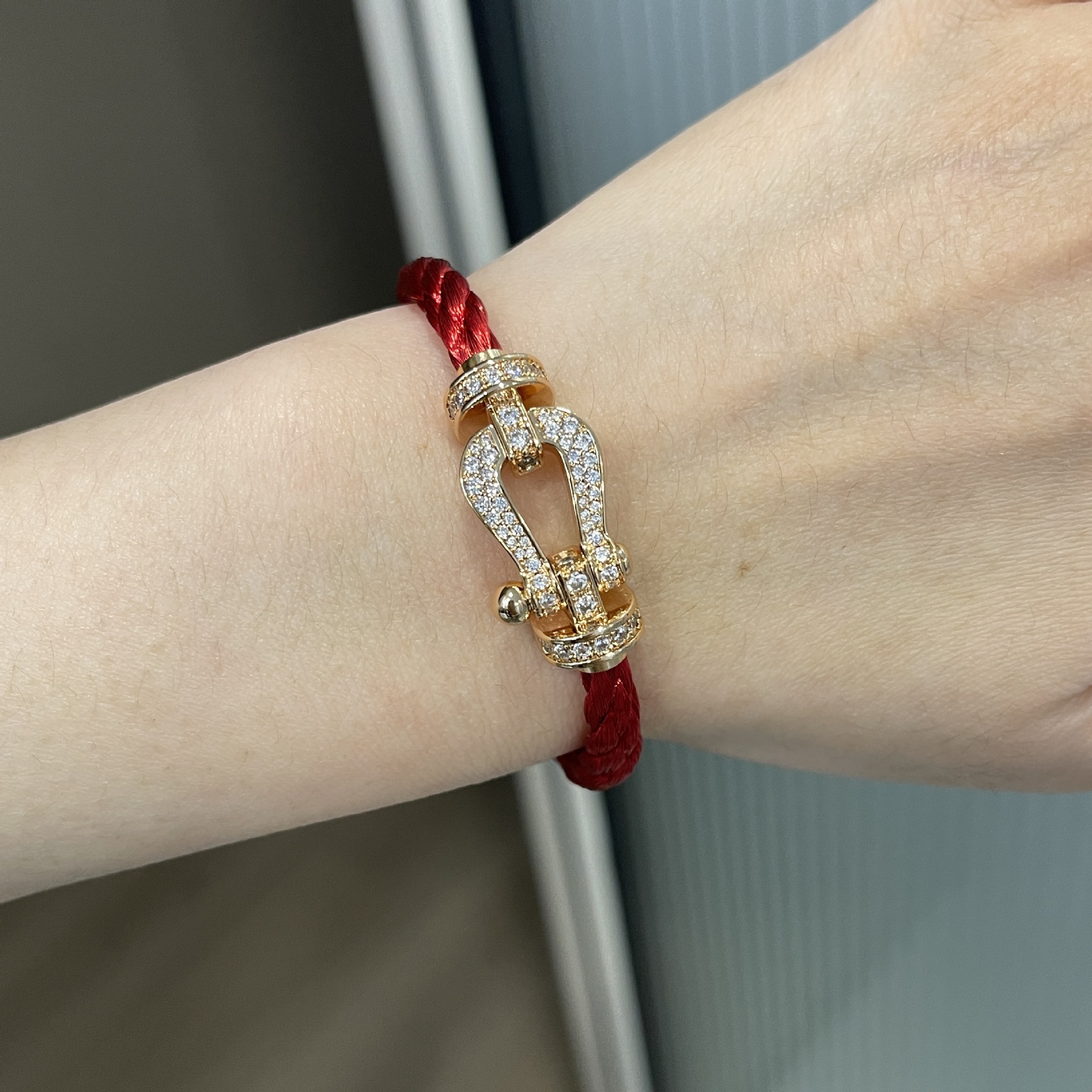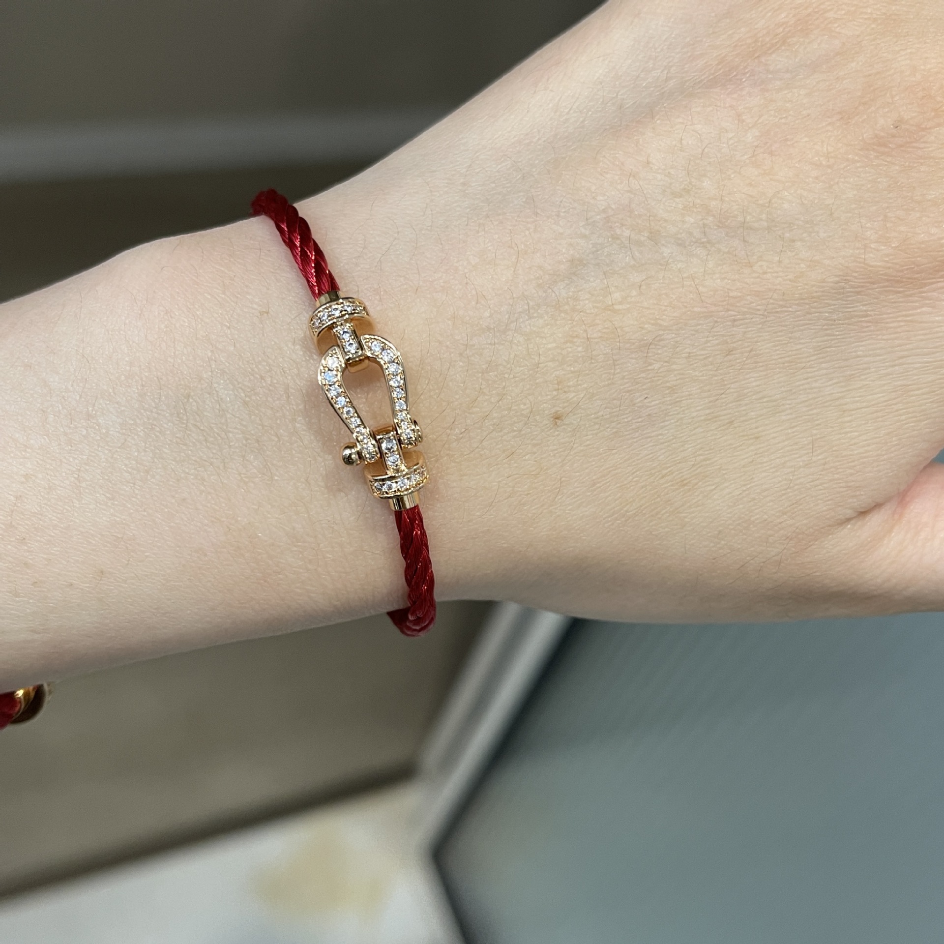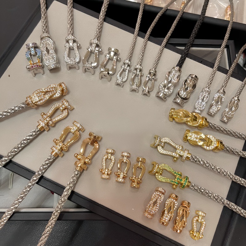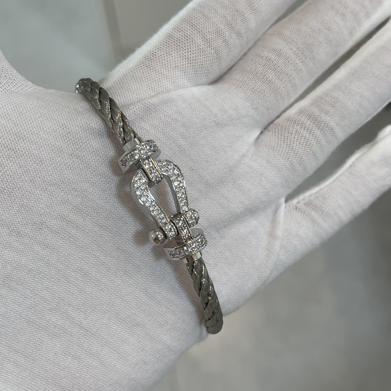 This bracelet features a black braided leather cord as the main body, with a metal buckle encrusted with diamonds, the buckle design is exquisite, the diamonds shine brightly, and the black and white colour scheme is classic and stylish. The bracelet combines the soft texture of leather with the luxury of diamonds, and has a unique style, which can be worn with casual wear to highlight personality, or with formal wear to add a touch of sophistication, suitable for those who pursue fashion and quality.