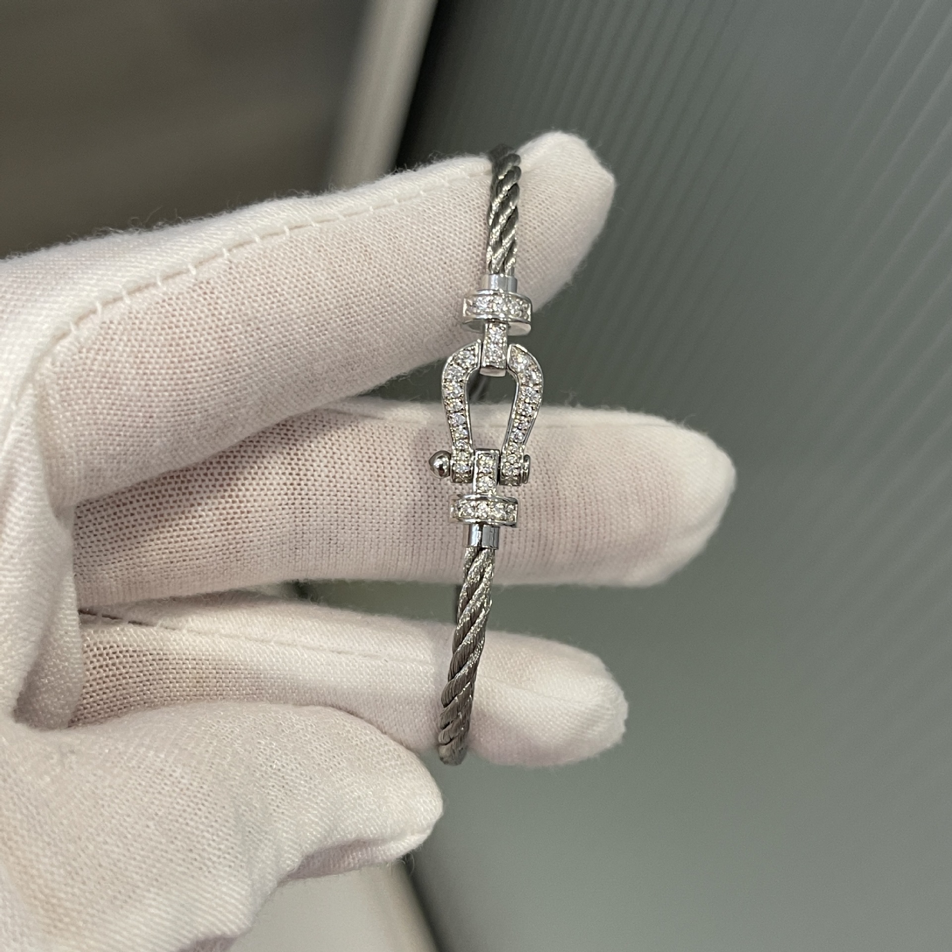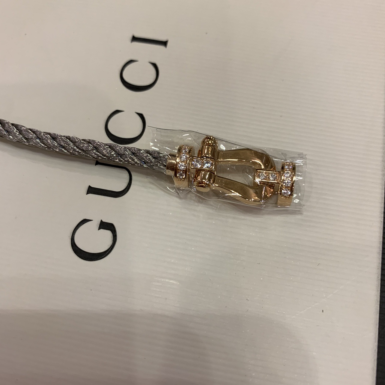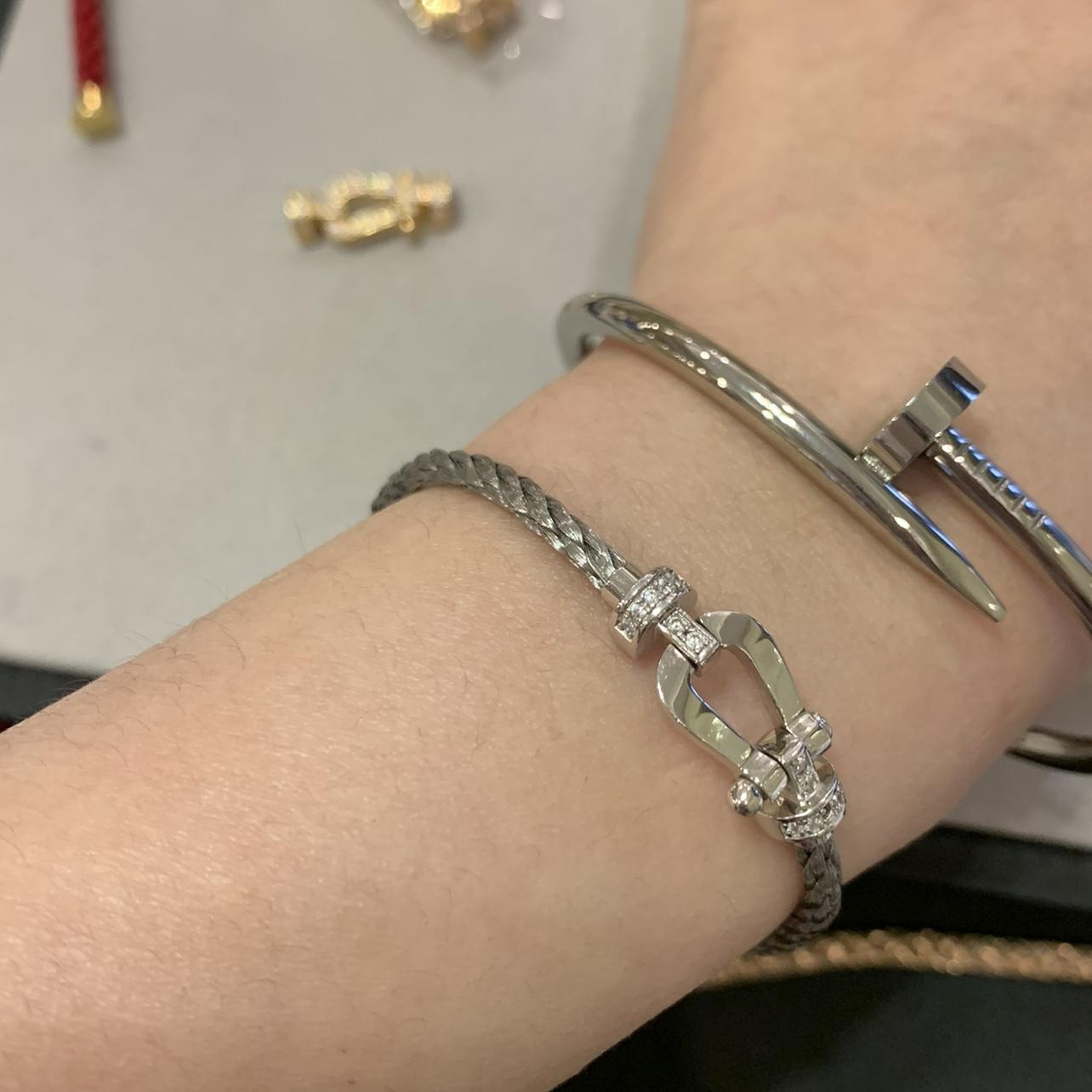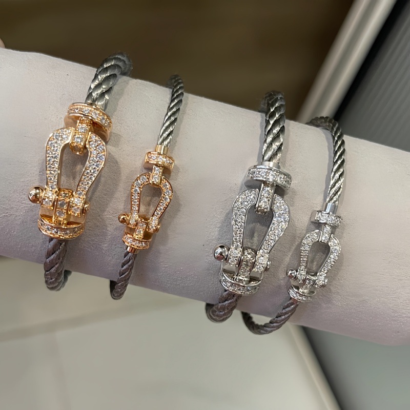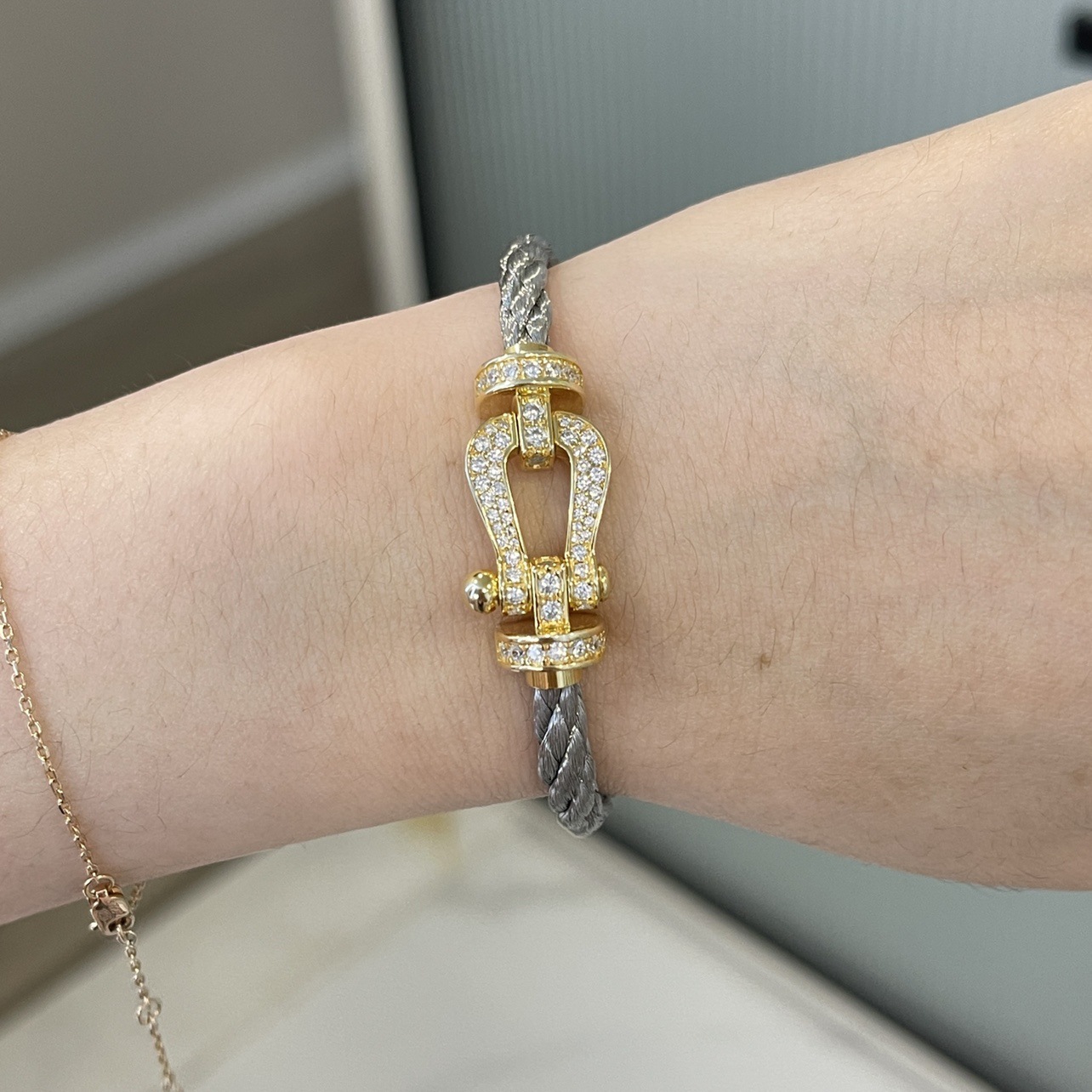 This bracelet features a black braided leather cord as the main body, with a metal buckle encrusted with diamonds, the buckle design is exquisite, the diamonds shine brightly, and the black and white colour scheme is classic and stylish. The bracelet combines the soft texture of leather with the luxury of diamonds, and has a unique style, which can be worn with casual wear to highlight personality, or with formal wear to add a touch of sophistication, suitable for those who pursue fashion and quality.