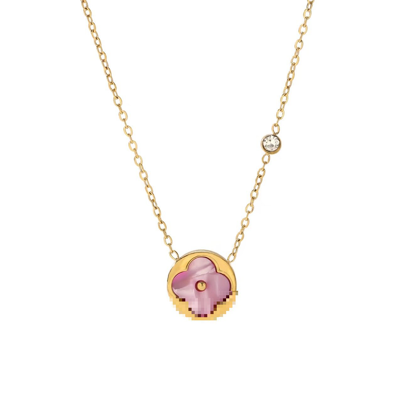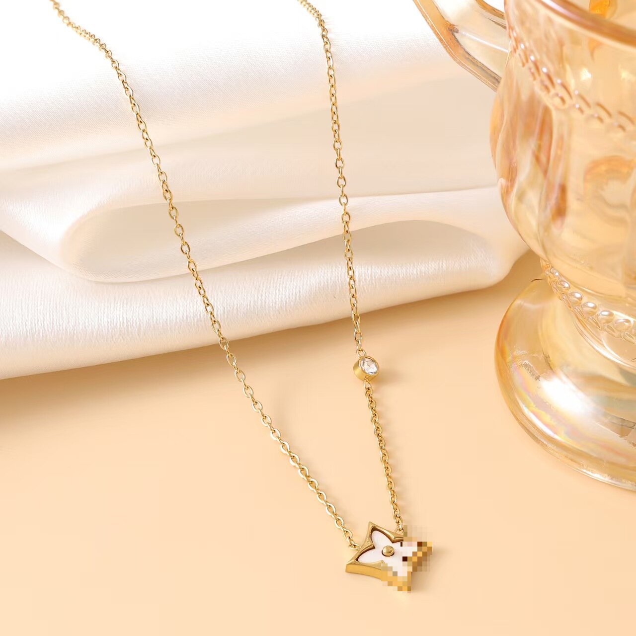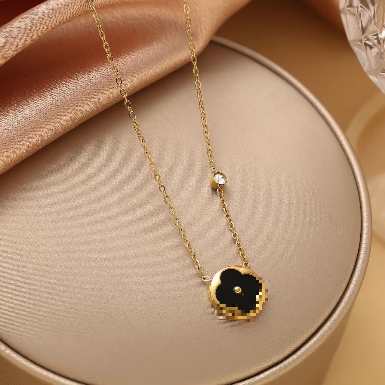 The necklace features a gold-gold chain adorned with a sparkling diamond. The pendant is in the shape of a four-leaf clover, and the main body is inlaid with white fritillary, which is more feminine against the golden border, and there is also a bead decoration in the centre. The overall design is exquisite and elegant, and the simplicity reveals a sense of luxury; whether it is paired with everyday casual wear or formal dresses, it can add charm to the wearer and convey the meaning of luck and beauty.
