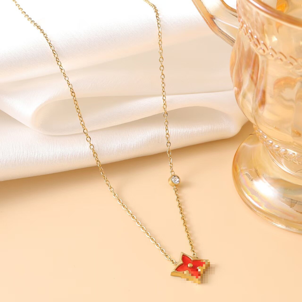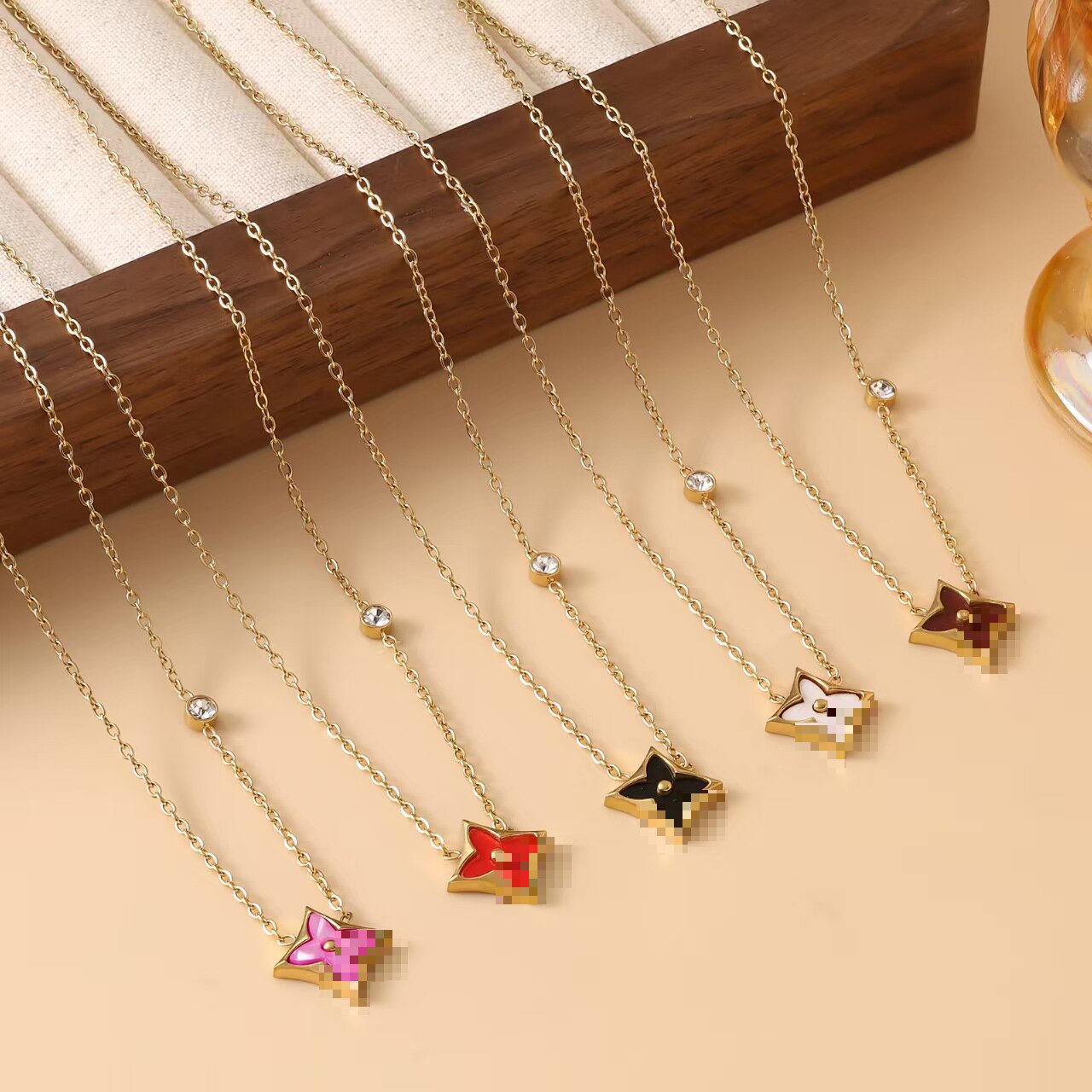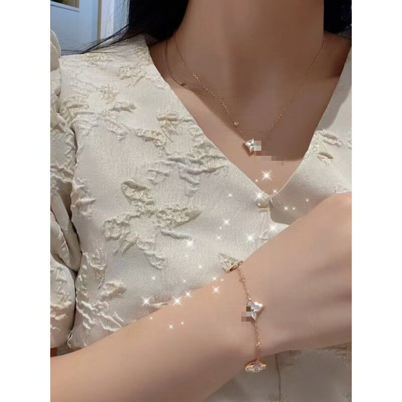 The necklace features a gold-gold chain adorned with a sparkling diamond. The pendant is in the shape of a four-leaf clover, and the main body is inlaid with white fritillary, which is more feminine against the golden border, and there is also a bead decoration in the centre. The overall design is exquisite and elegant, and the simplicity reveals a sense of luxury; whether it is paired with everyday casual wear or formal dresses, it can add charm to the wearer and convey the meaning of luck and beauty.