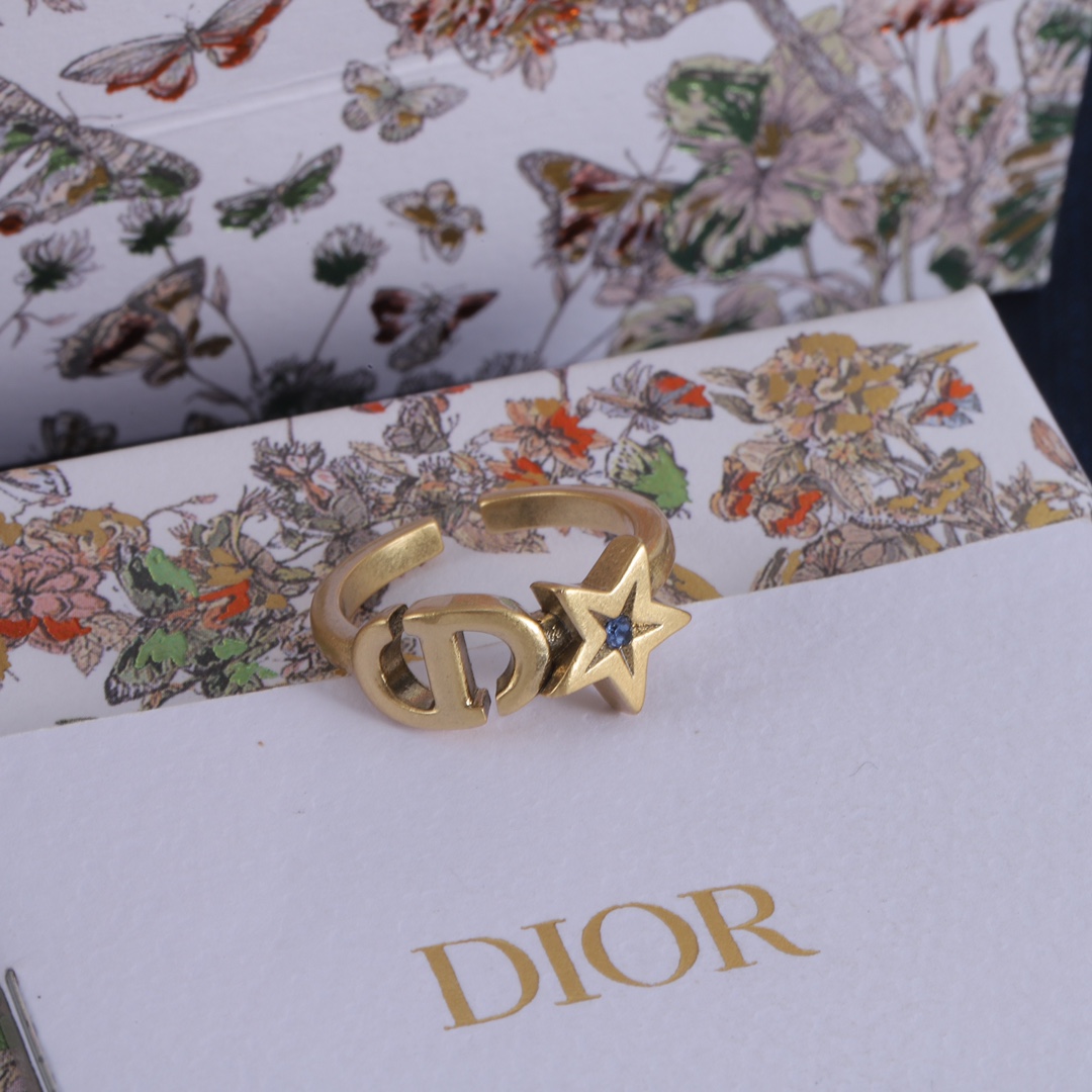 Dior's signature design is based on vintage gold, combining the brand's lettering with a star element, embellished with blue diamonds in the center of the star. The opening design fits the fingers, adapting to daily and trendy wear, highlighting the brand's recognition and unique taste.
