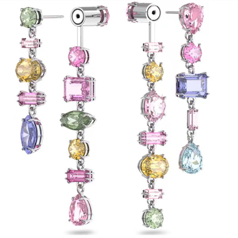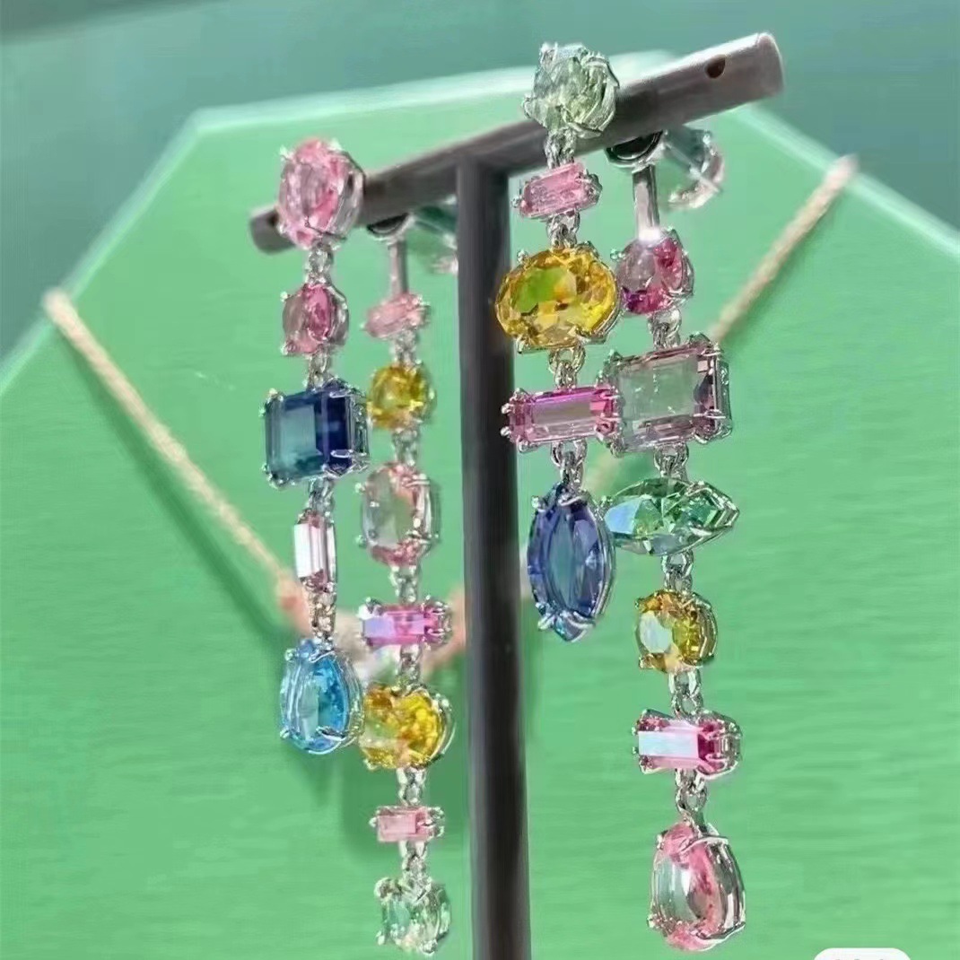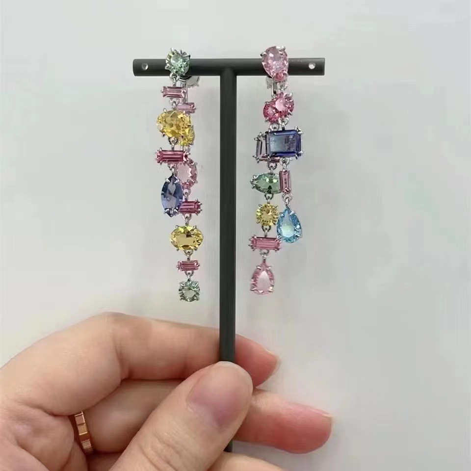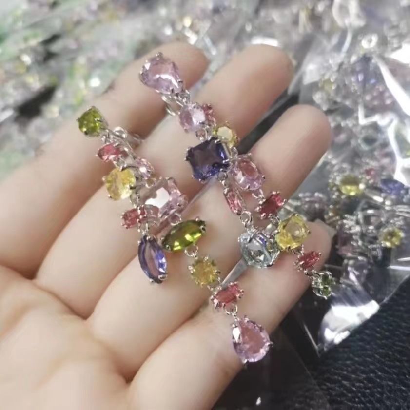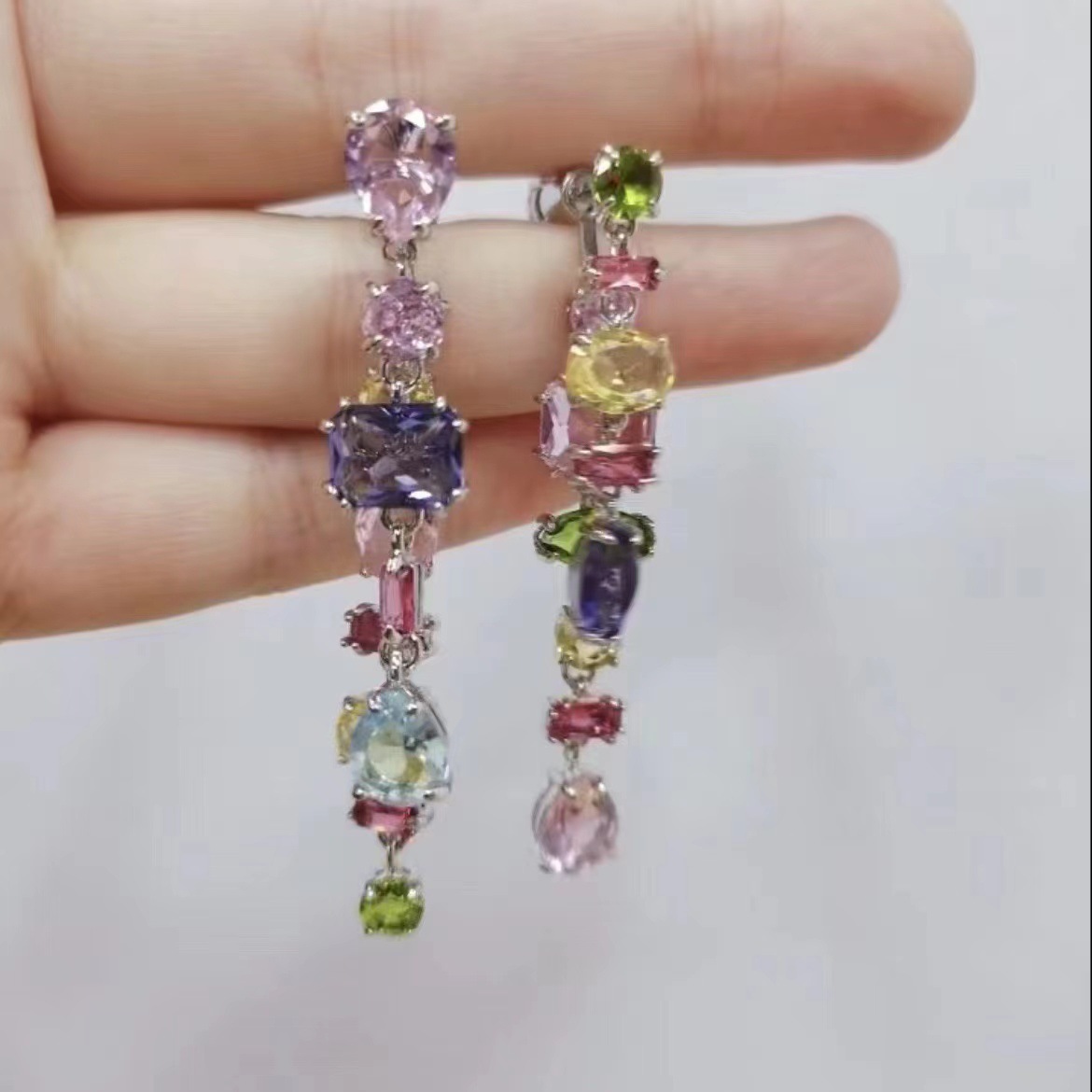 These earrings are based on silver metal, strung with gemstones of various shapes and colors, covering round, square, marquise, etc., in colors such as pink, yellow, purple, green, etc. Different gemstones hang down layer by layer, staggered, showing agility and gorgeousness. It is suitable for wearing at parties, dinners and other occasions, adding a romantic and dreamy atmosphere and unique charm to the look.