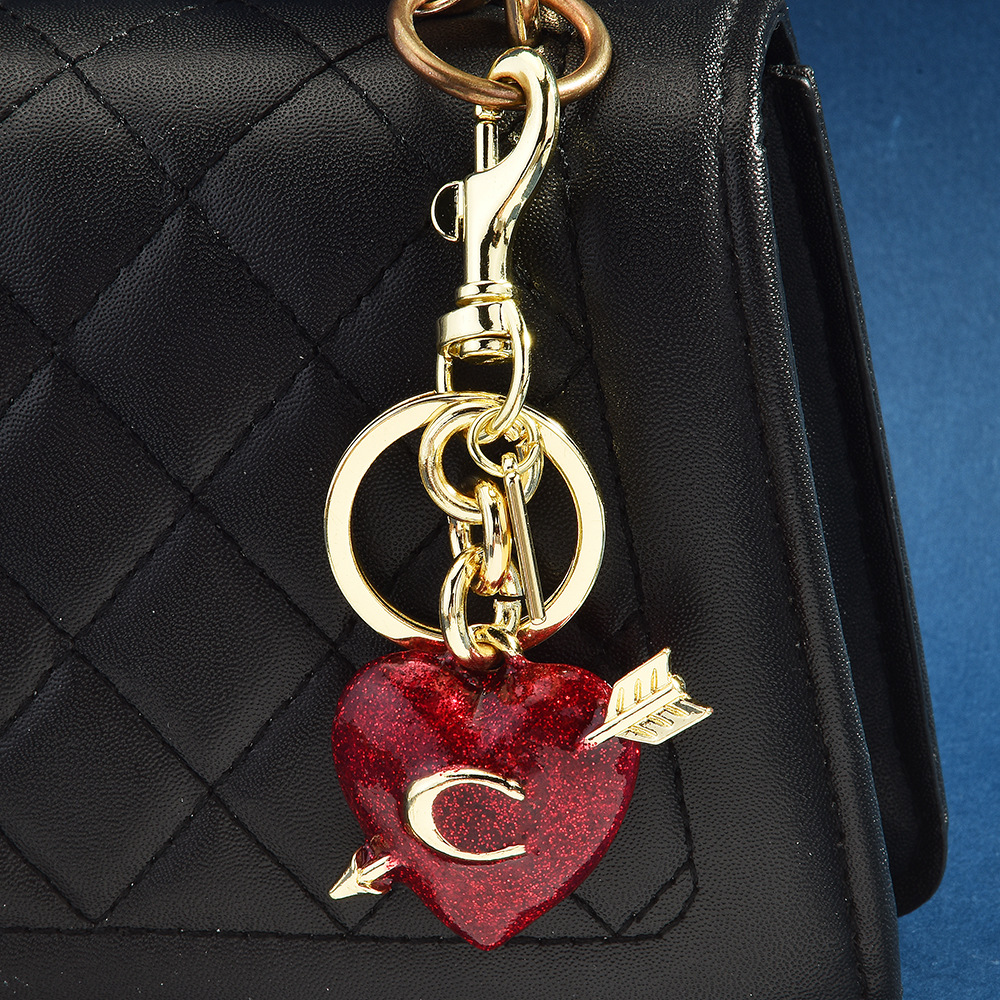 This keychain features a romantic heart in red glitter with gold arrows and lettering. The metal hook and ring design is sturdy and durable, and can be easily hung on keys and bags, adding personality and sweet atmosphere to daily wear, and is a trendy little item for personal use or gifting.