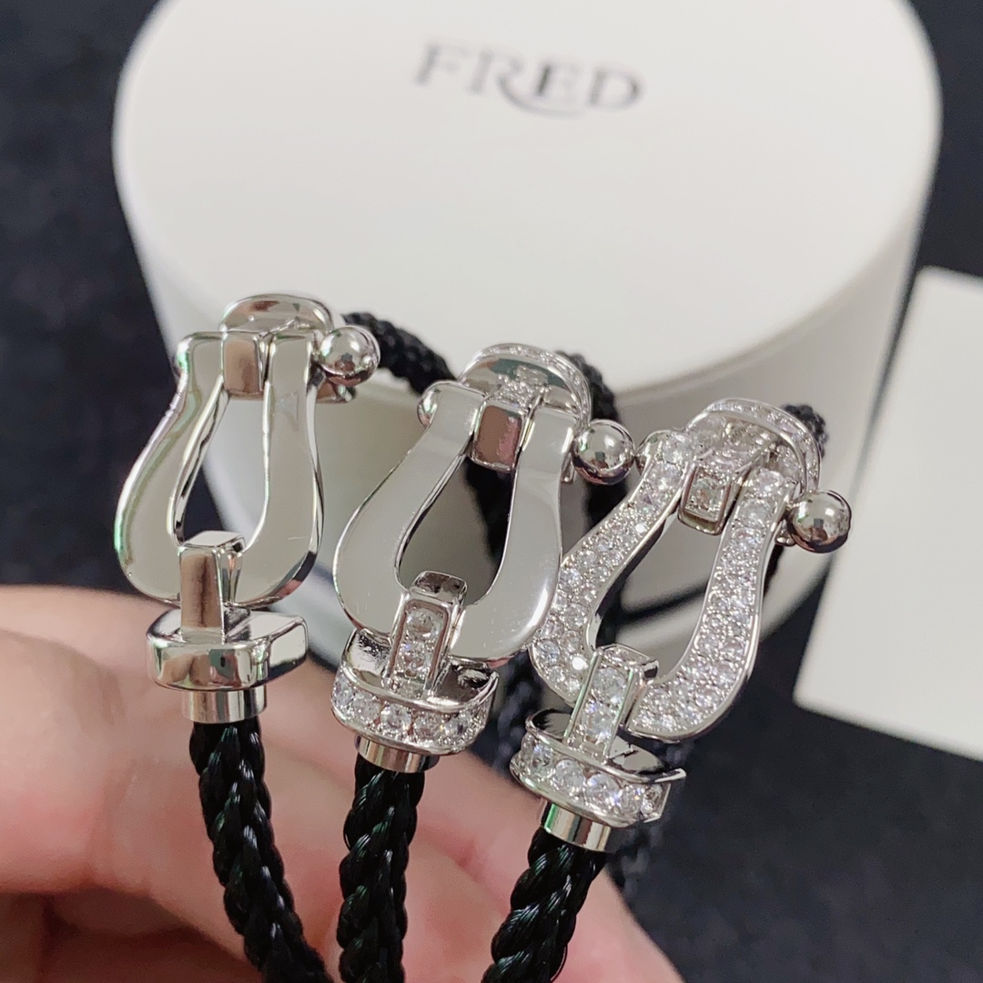 A replica of the FRED classic design, with a black cord and a silver horseshoe buckle, some of the buckles are set with diamonds. Simple and fashionable, implying lucky protection, suitable for daily wear, can be used as a personalized hand jewelry to show taste, and easily enhance the sophistication of the shape.