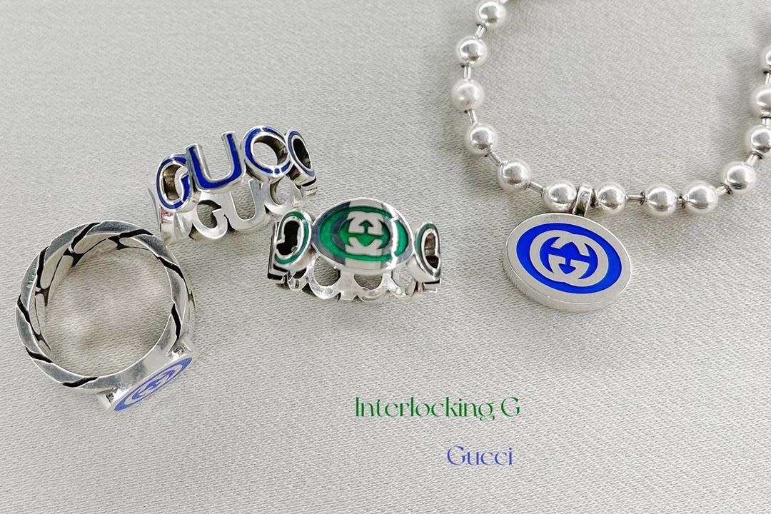 GUCCI's classic double G element, silver base with colorful enamel, necklace and ring. The color collision shows the trendy personality, restores the brand's retro fashion genes, adapts to the street and personalized wear, and is a fashion suit that highlights the brand recognition.
