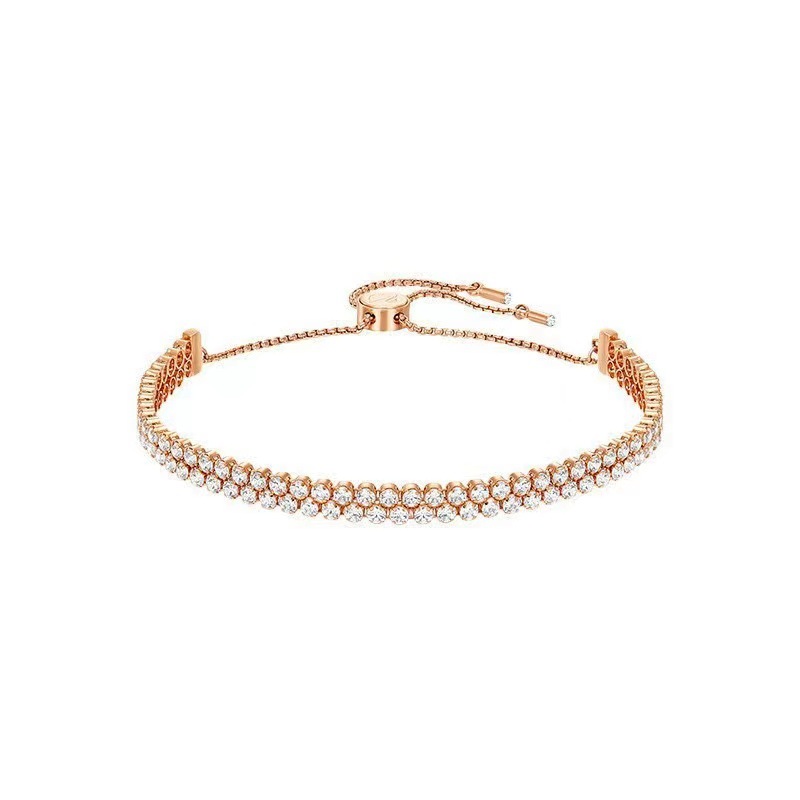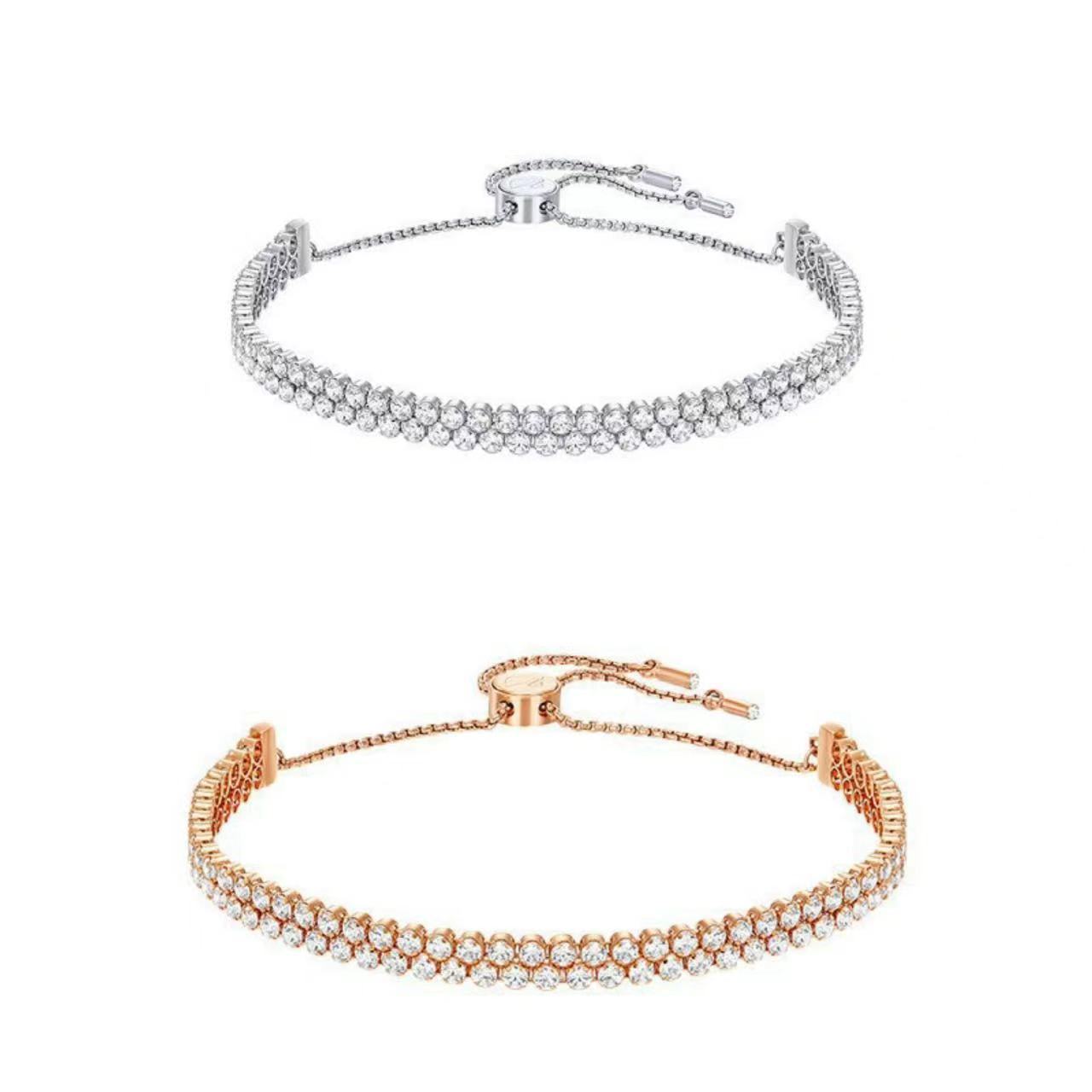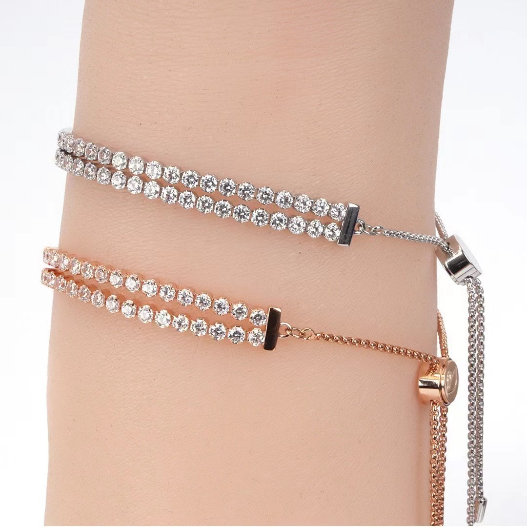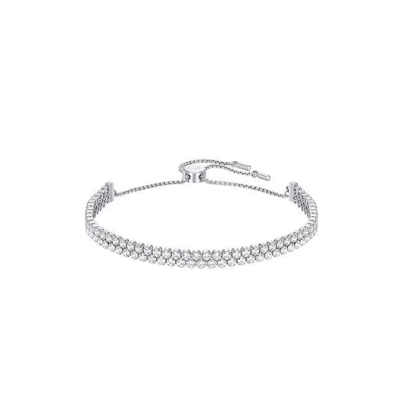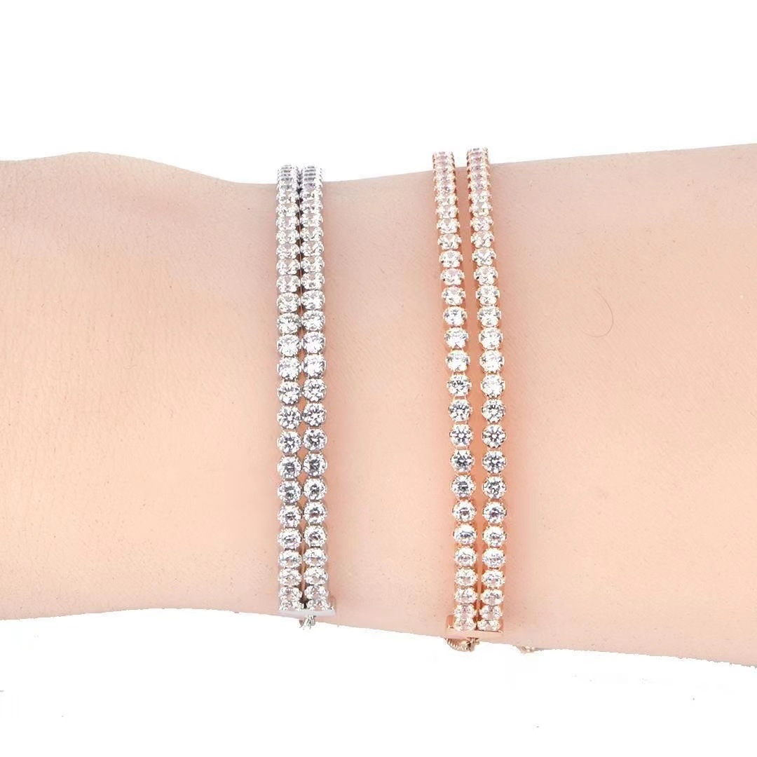 This bracelet is made of silver and is presented in a double-layered full diamond design, with diamonds arranged in a tight and regular arrangement that shines brightly. The bracelet is equipped with an adjustable chain clasp for easy wearing. The overall shape is luxurious and atmospheric, suitable for formal occasions such as dinners and weddings, which can instantly enhance the wearer's elegance and fashion taste.