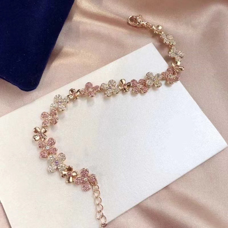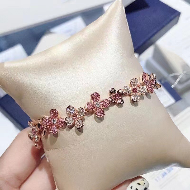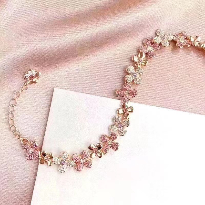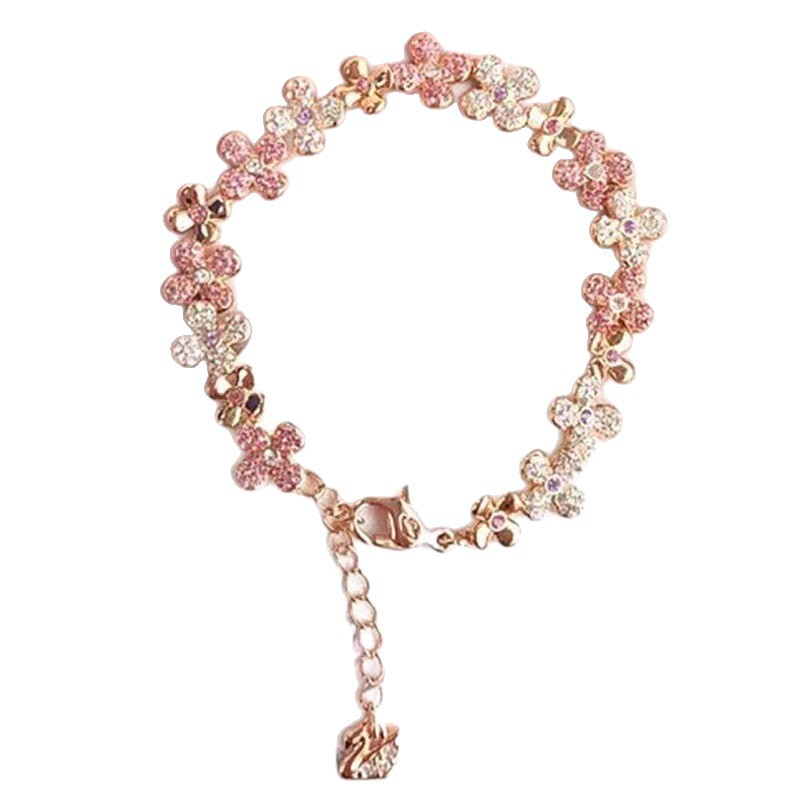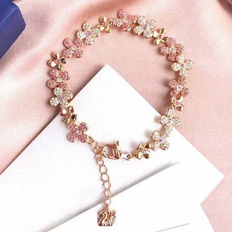 The bracelet is made of rose gold and is made up of flowers set with pink and transparent rhinestones. Pair it with a delicate swan pendant for a touch of elegance and romance. The overall design of the bracelet is exquisite, suitable for daily wear or as a gift, whether it is paired with casual wear or a dress, it can add highlights to the outfit, showing the femininity and charm of women.