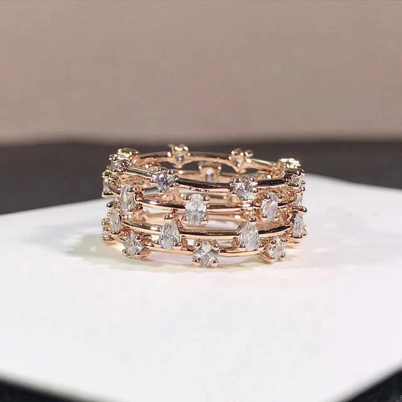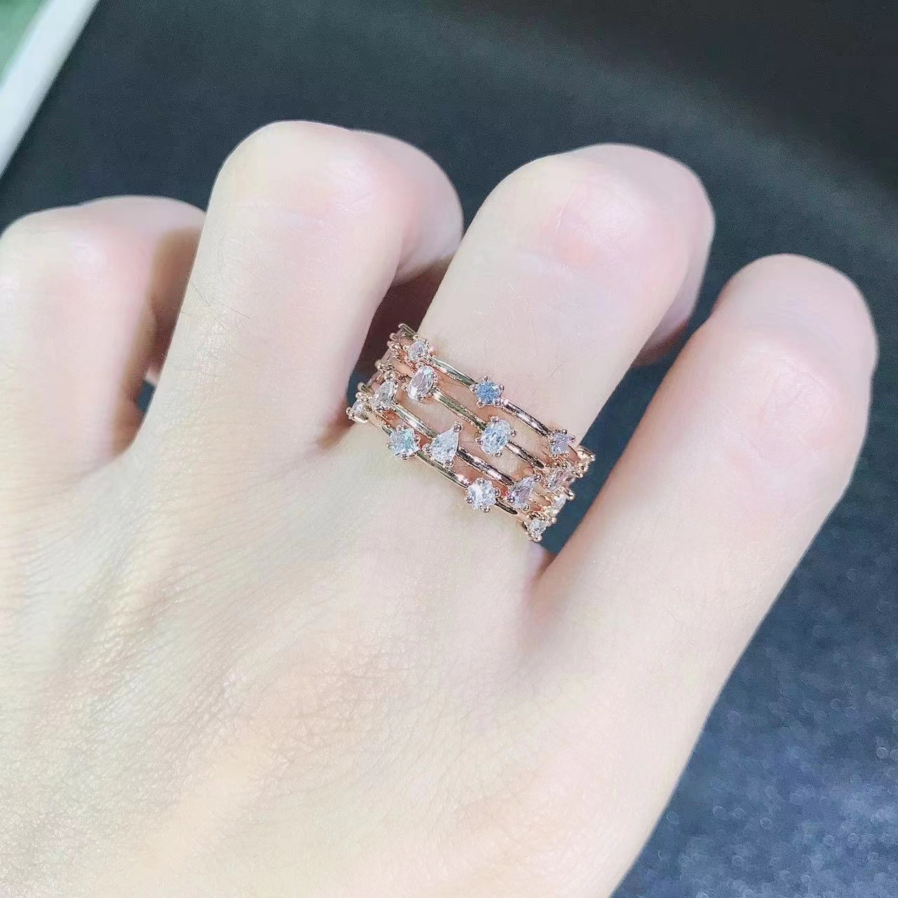 The ring is made of rose gold, with a multi-layered openwork design and a variety of shapes of transparent diamonds, which are staggered and eye-catching. It can be worn alone to show a unique style, or it can be layered with other rings, suitable for daily life, parties and other occasions, adding a sense of exquisite and gorgeous to the fingertips, which is the personality choice of fashionistas.