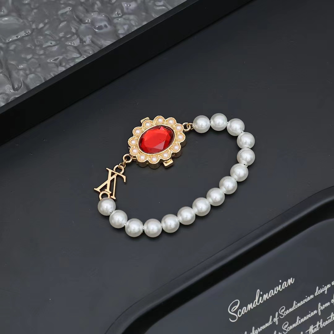 Vintage court style pearl bracelet Red diamond pendant letter hand ornament Elegant fashion jewelry