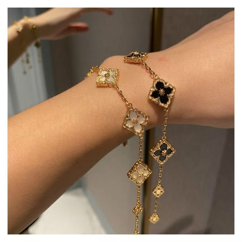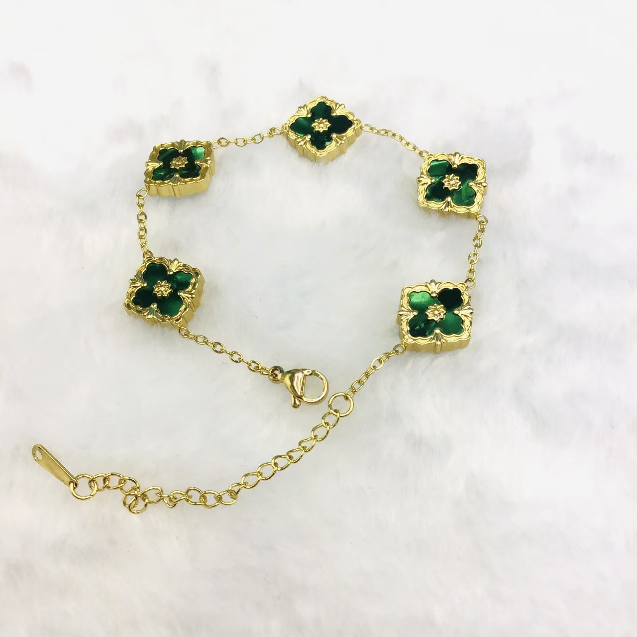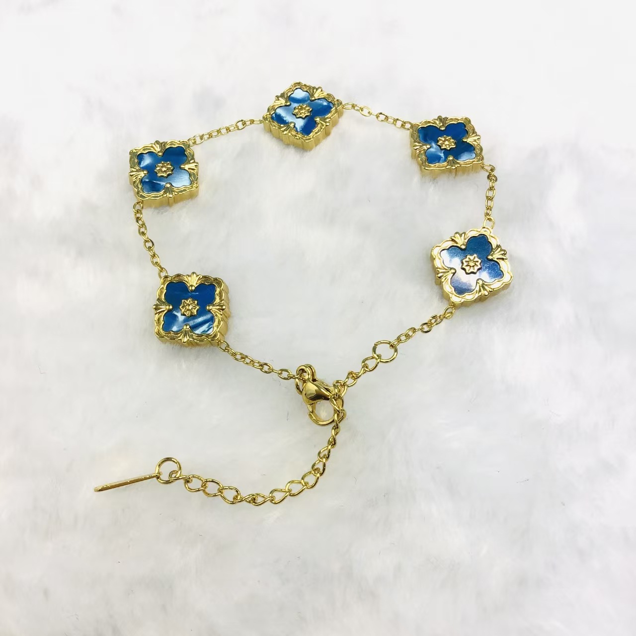 This bracelet features a gold-toned chain that connects multiple delicate four-leaf clover-shaped pendants. The pendant is dominated by white fritillary, with a soft surface lustre, with gold borders and pattern decorations, showing exquisite elegance. The bracelet length is adjustable to suit wearers of different wrist sizes. Whether it is a casual outfit for everyday wear or a dress for special occasions, it can add highlights to the overall look and convey the meaning of luck and beauty.
