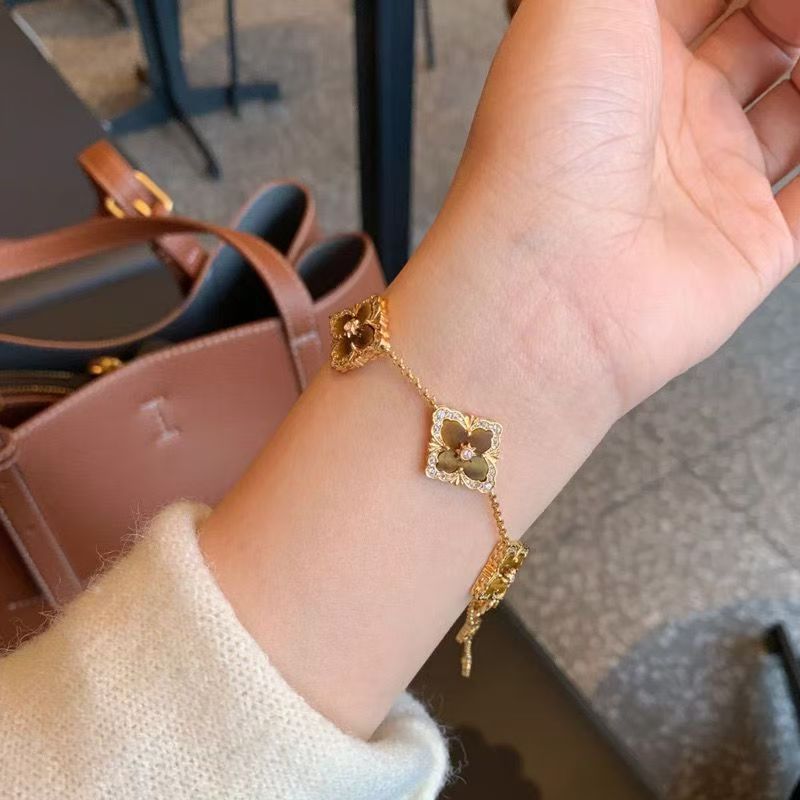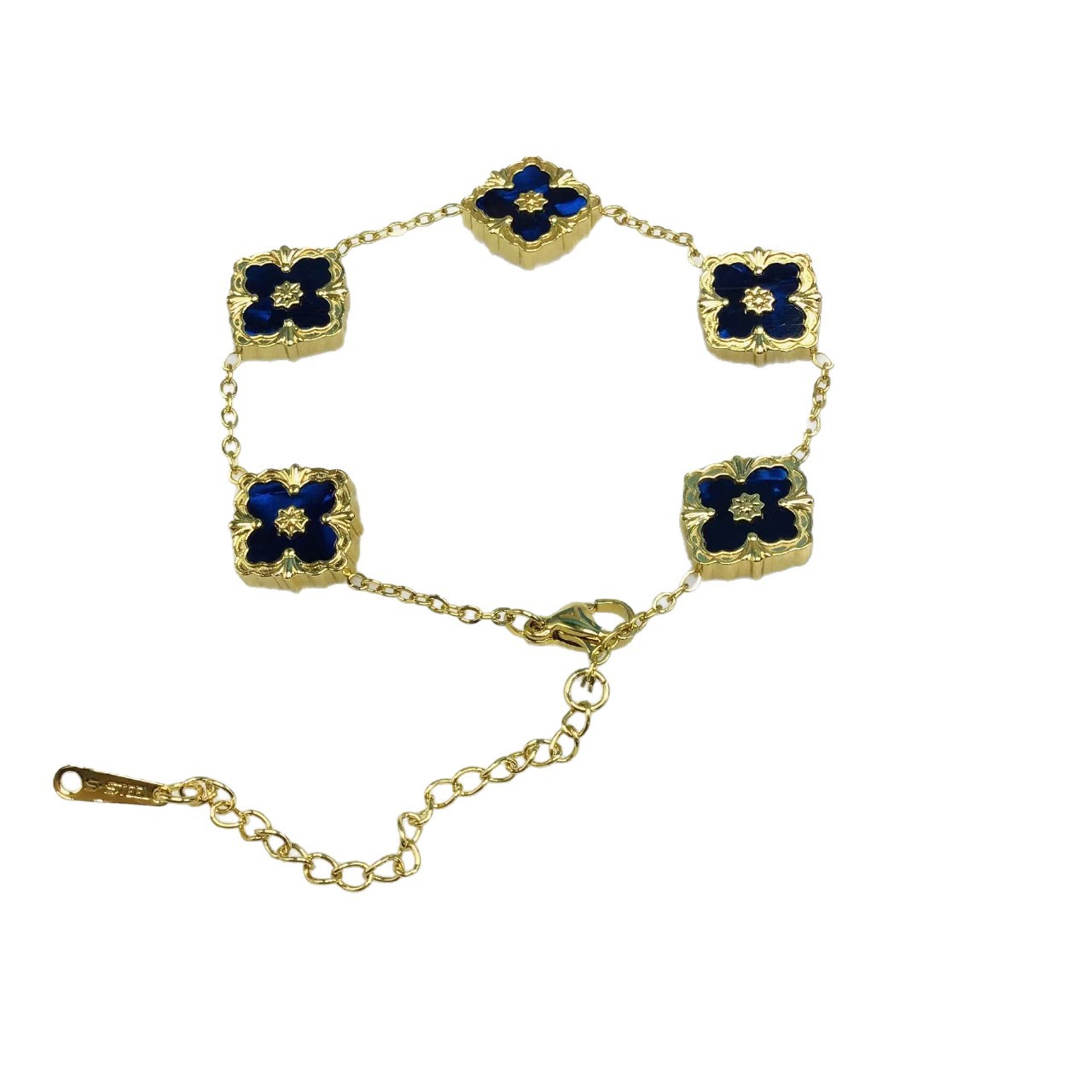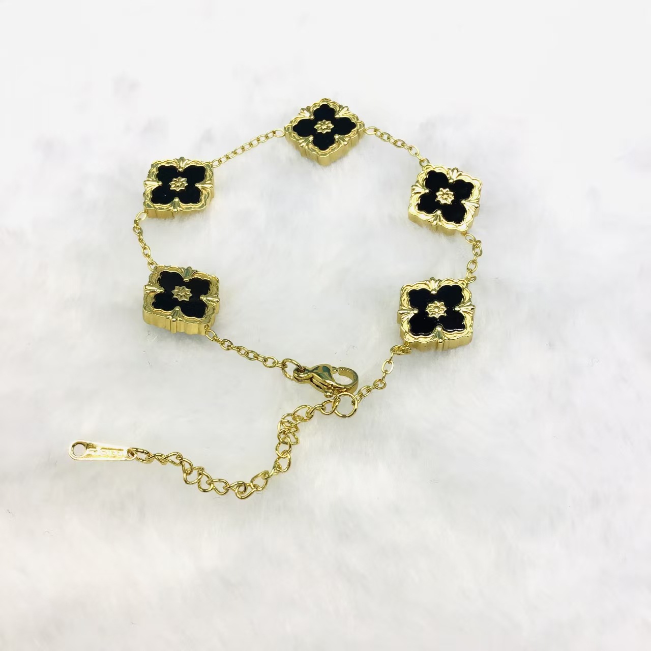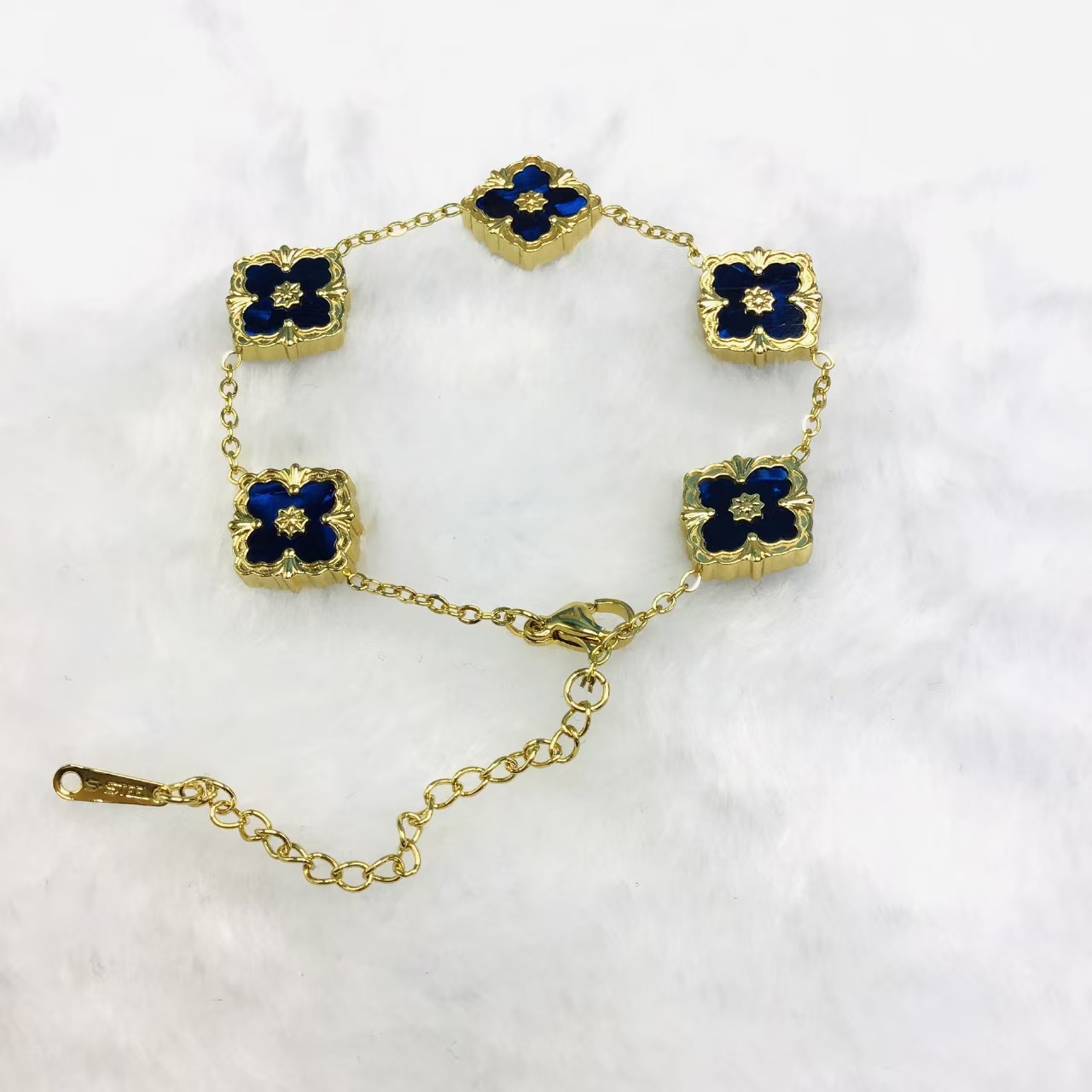 This bracelet features a gold-toned chain that connects multiple delicate four-leaf clover-shaped pendants. The pendant is dominated by white fritillary, with a soft surface lustre, with gold borders and pattern decorations, showing exquisite elegance. The bracelet length is adjustable to suit wearers of different wrist sizes. Whether it is a casual outfit for everyday wear or a dress for special occasions, it can add highlights to the overall look and convey the meaning of luck and beauty.